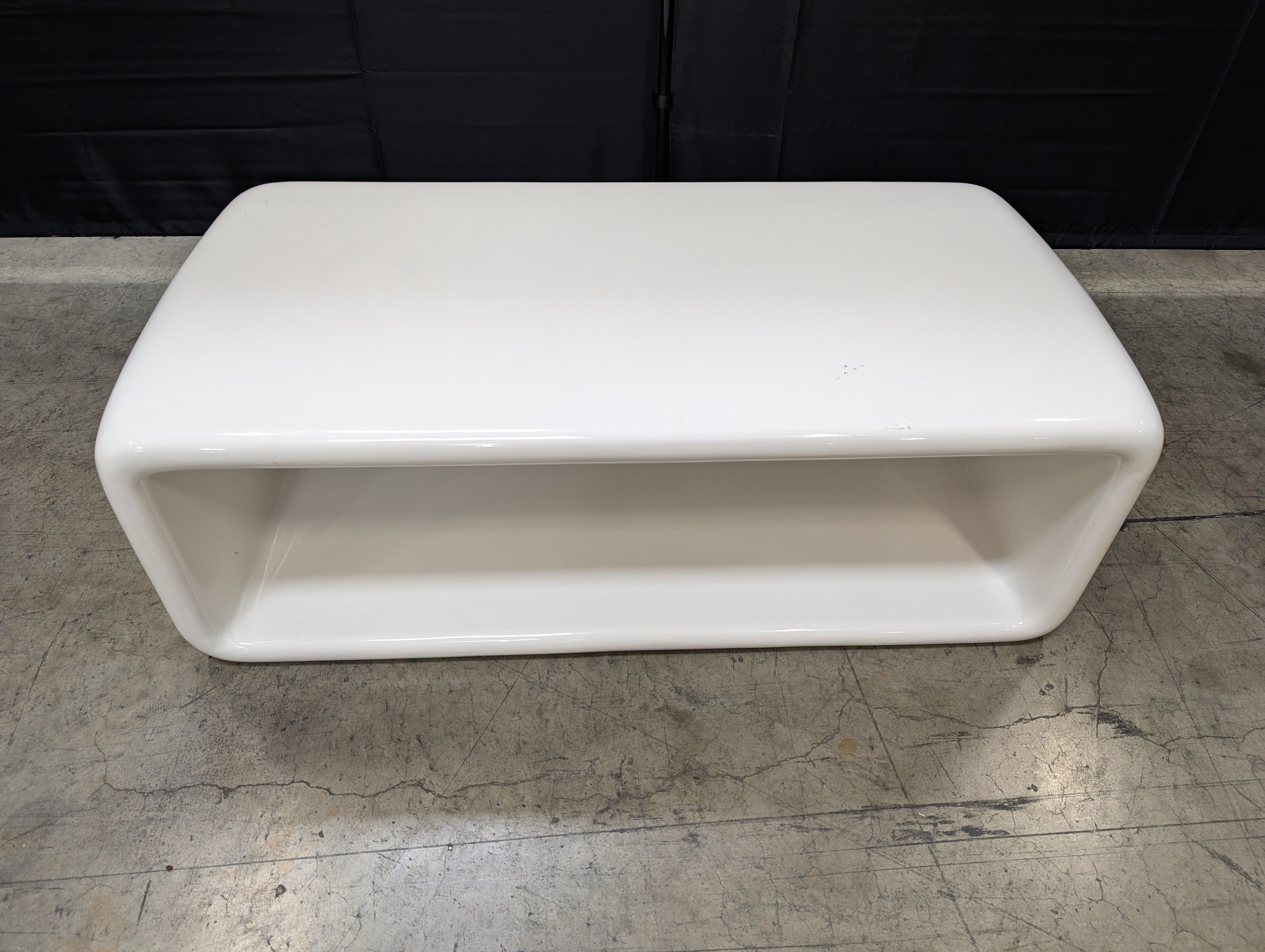 This contemporary coffee table features a sleek white finish and a rectangular form. It has smoothly rounded corners and an open, hollow center design. The table presents a high-gloss surface.