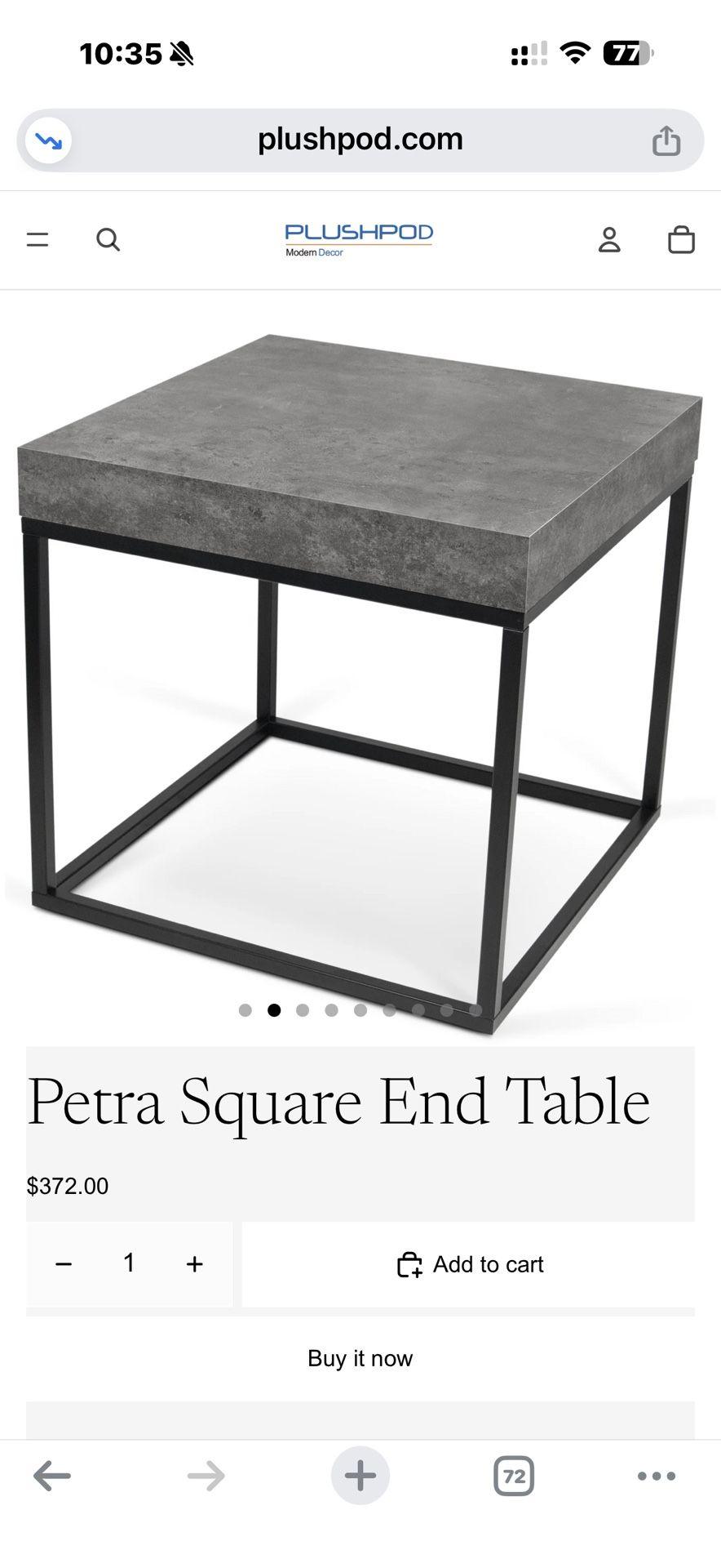 Lightly used Designer: Temahome A contemprorary side table with minimal squared metal legs and a unique thick top made of a faux-concrete look finish. Description: The Petra side table is stunning and simplistic and part a larger collection. This table will lend a modern look to your living room with its straight line design and squared metal base. The thick, heavy-duty top contrasts beautifully with the minimal bottom to give you an eye-catching piece of furniture. The top surface is a very durable laminate for everyday living - easy cleaning and no scratching. There is also a matching coffee tables. Other pieces in this concrete finish include sideboards, shelving, and others. Material: melamine top, engineered wood structure, steel Finish: faux concrete look, matt black metal legs Dimensions: Overall: 22" x 22" x 21" high Leg thickness: 2 cm Table top thickness: 3''