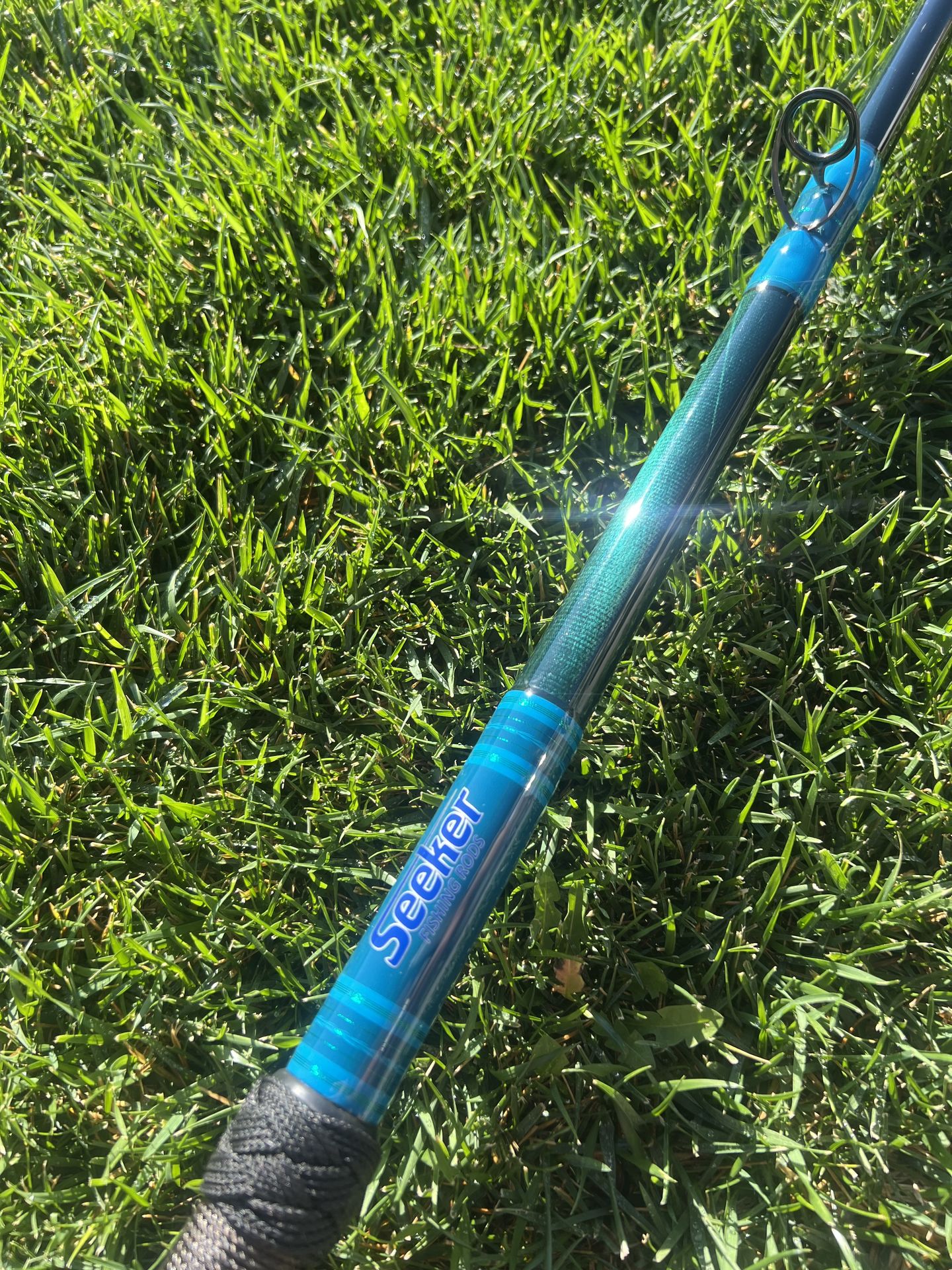 Brand new custom wrapped Super Seeker CJBF 100 “ blue tint “ composite jig stick . It’s 10’ long . Has all Fuji guides and tip . Black tuna cord handle and black Turks head. Really nice jig stick fishing yellowtail with surface irons . Located in Fontana . Pick up only in Fontana . Fishing rod Fishing pole Fishing reel Calstar Seeker Okuma Phenix Daiwa Penn Shimano Avet Accurate