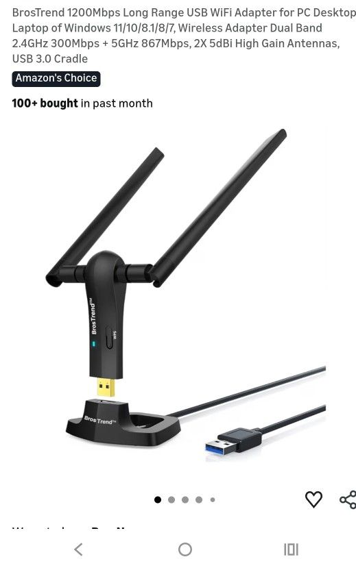 BrosTrend 1200Mbps Long Range USB WiFi Adapter for PC Desktop Laptop of Windows 11/10/8.1/8/7, Wireless Adapter Dual Band 2.4GHz 300Mbps + 5GHz 867Mbps, 2X 5dBi High Gain Antennas, USB 3.0 Cradle Compatible DevicesPC, Computer, Desktop, Laptop Product Dimensions3.7"L x 3.9"W x 7"H Data Link ProtocolIEEE 802.11 ac/n/a 5GHz, IEEE 802.11 n/g/b 2.4GHz ULTIMATE Wi-Fi SPEED: You Can Get 867Mbps Wireless Speed on 5GHz WiFi Band or 300Mbps Speed on 2.4GHz WiFi Band, Excellent for Online 4K Video, Gaming, High Quality Music and Facebook by Using this Dual Band USB WiFi Adapter BOOST YOUR RANGE: Comes with 2 pieces of 5dBi High Gain WiFi Antennas, this Long Range WiFi Adapter Ensures Range Extended WiFi and Superior Stability on Your Desktop, Laptop, PC FLEXIBLE DEPLOYMENT: Equipped with a USB 3.0 Cradle with Extension Cable of 5 Feet, Connect it to Any USB Ports of Your Desktop, Laptop or PC and Put this USB WiFi Network Adapter in Spot with Optimal WiFi Signal Reception; Or You Can Also Plug this USB WiFi Dongle Directly to Any USB Port of Your Desktops or Laptops USB 3.0 PORT WITH GOLD PLATED: Comes with USB 3.0 Port which Works 10 Times Faster than USB 2.0; USB Port with Gold Plated Ensures More Stable and Solid Internet Connection; And it is Backward Compatible with USB 2.0 Port; Your Best WiFi Adapter for PC of Desktop and Laptop UNIVERSAL COMPATIBILITY: This Wireless Adapter Works with Any WiFi Routers; Supports Windows 11/10/8.1/8/7; Linux is NOT supported; To Get OPTIMUM WiFi SPEED, Please Download Latest Driver on BrosTrend Official Web; Offers 7X24 Technical Support ADVANCED WPA3 SECURITY: Secure Your Devices and Network Privacy by Supporting the Latest Wireless Encryption: WPA3-SAE, WPA2/WPA/WEP, AES/PSK/TKIP, 802.1x. Note: The chipset model number is Realtek RTL8812BU or RTL8822BU