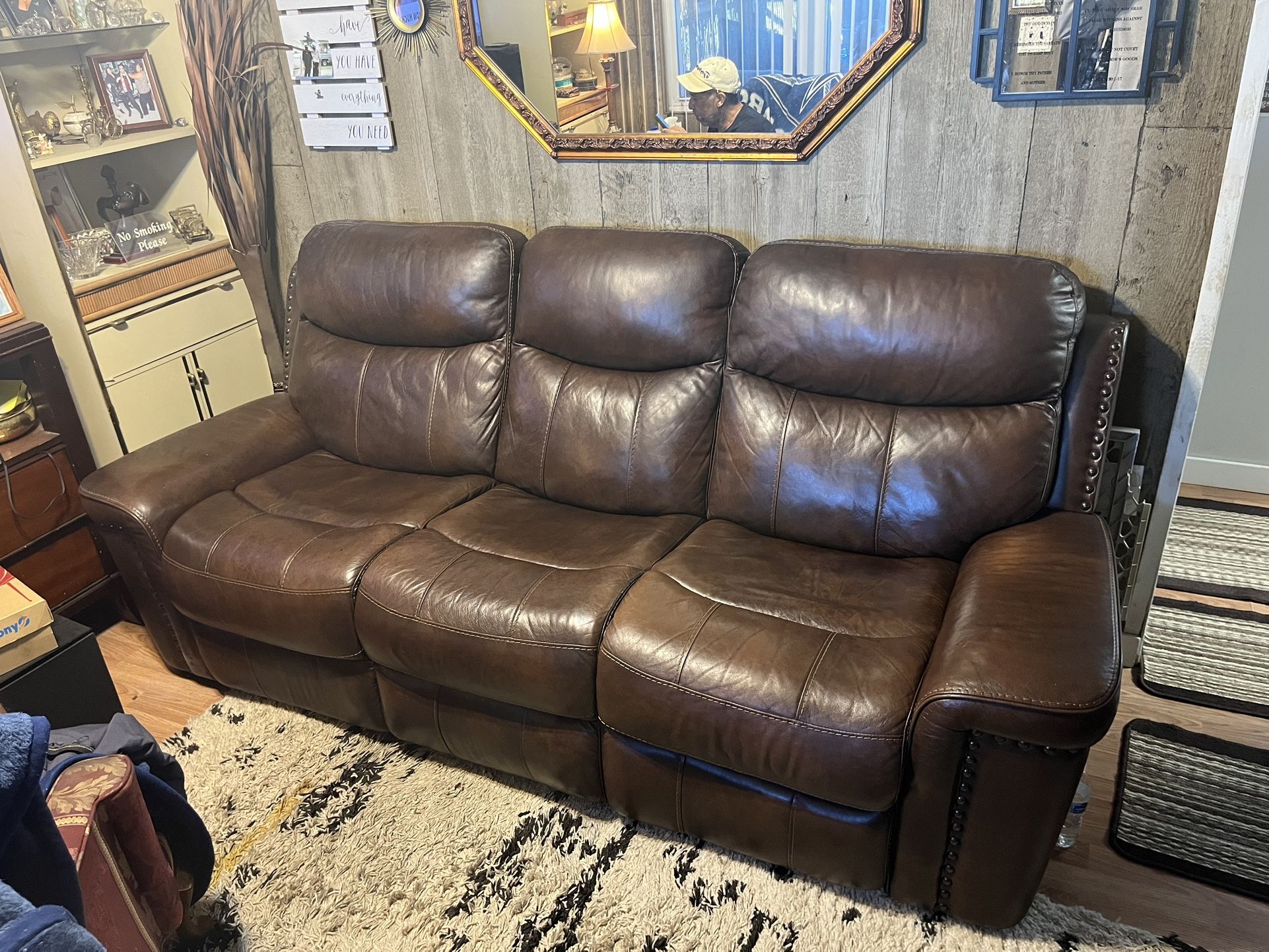 Brown Leather Sofa With Two Electric Reclining Seats.