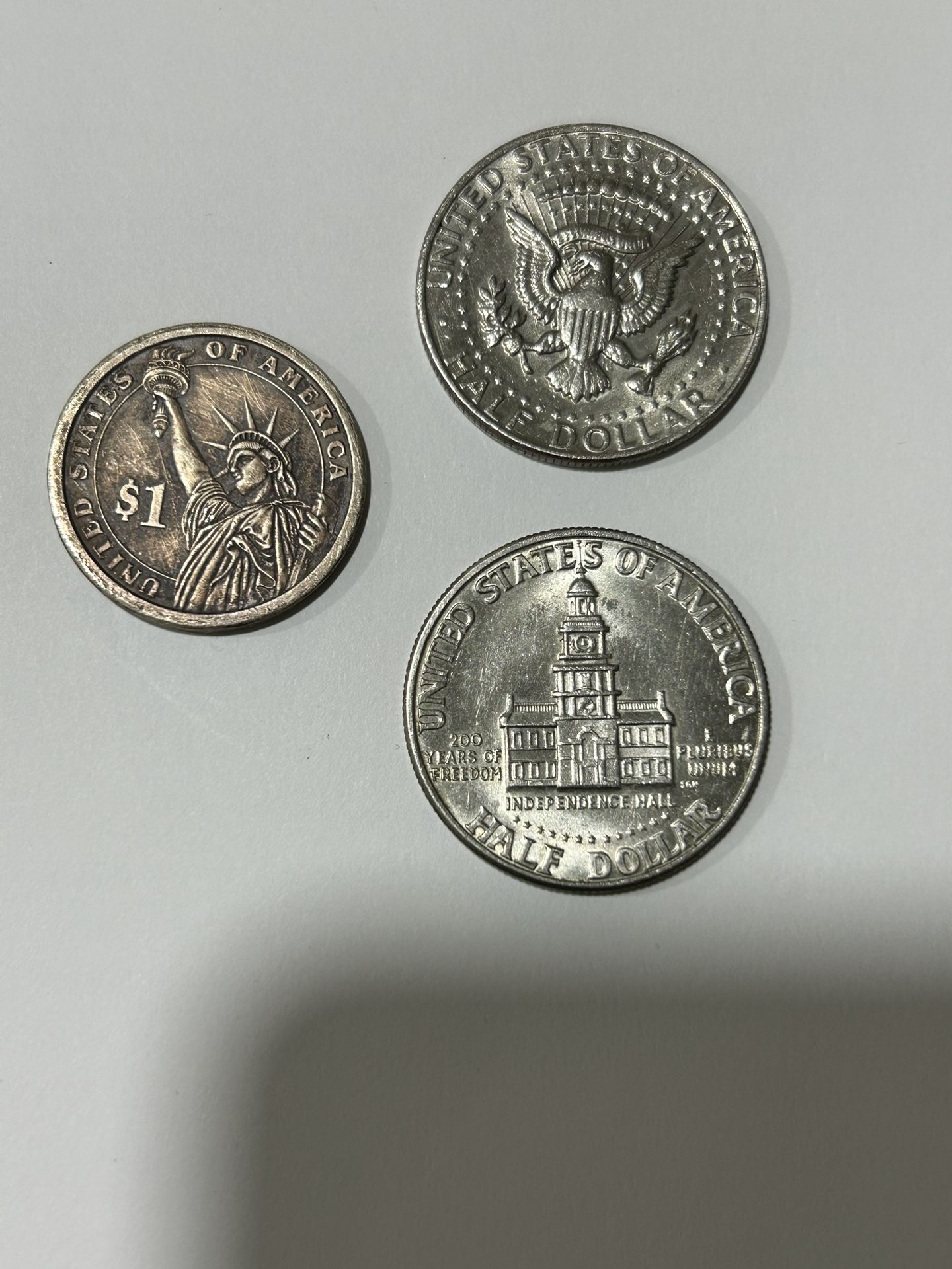1. Thomas Jefferson $1 Coin (Presidential Dollar Series): • Obverse: Features Thomas Jefferson with his name and “3rd President 1(contact info removed).” • Reverse: Depicts the Statue of Liberty and “$1” written on it. 2. John F. Kennedy Half Dollar (1977): • Obverse: Portrait of JFK with “In God We Trust” and the year 1977. • Reverse: Presidential seal with “United States of America” and “Half Dollar.” 3. 1(contact info removed) Bicentennial Kennedy Half Dollar: • Obverse: JFK’s profile with dual dates “1(contact info removed).” • Reverse: Independence Hall with “200 Years of Freedom.”