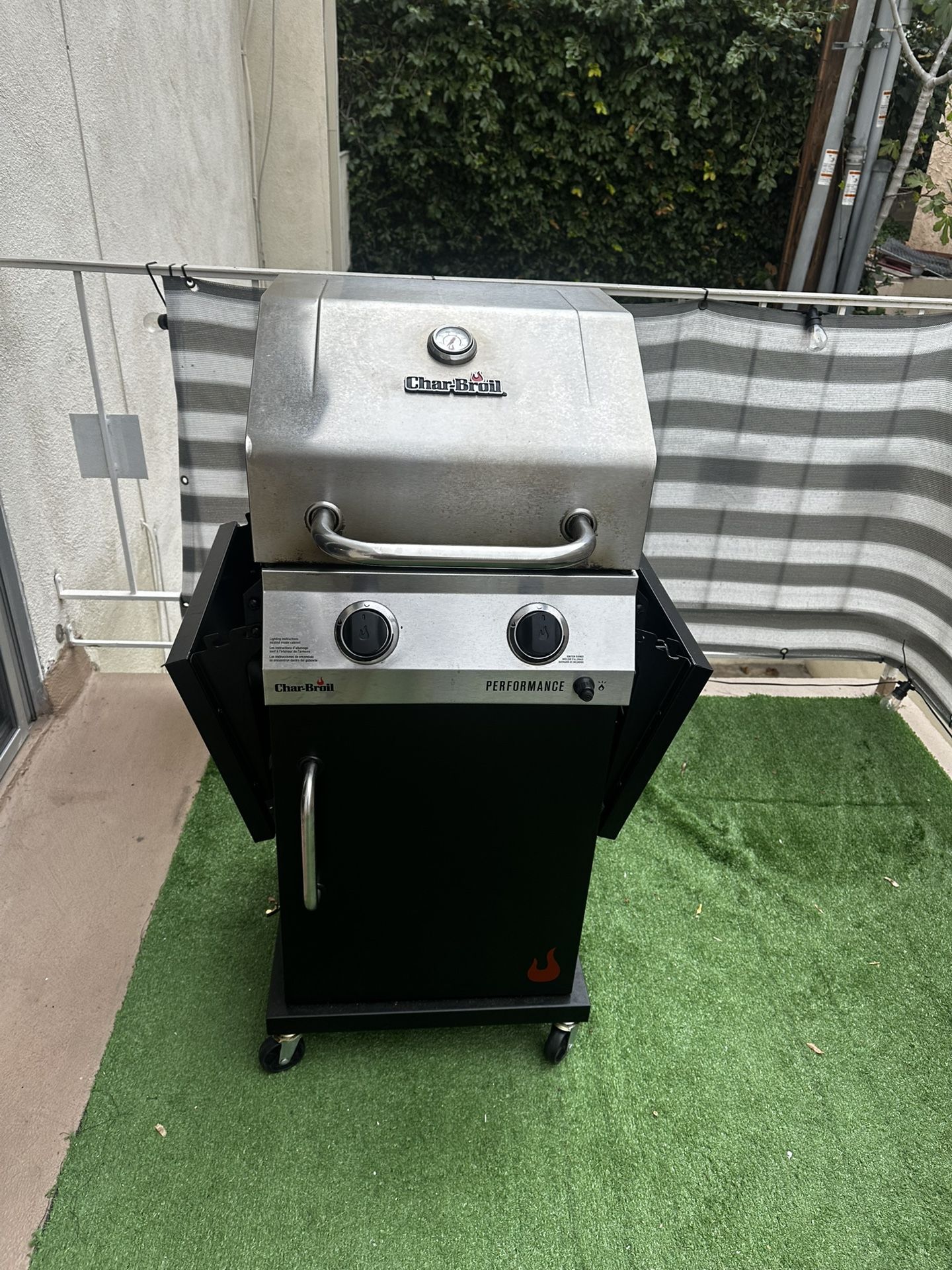 Gas Grill: 20,000 BTUs with 2 top-ported stainless steel burners for lasting performance. BTU is a measurement of energy used by your grill and is not related to how hot it will get. Grills with lower BTUs burn less fuel to cook your food. Grates: Porcelain-coated Cast Iron grates for heat retention and rust-resistance Temp Gauge: Lid-mounted temperature gauge to easily monitor the inside temperature of your grill. Reliable: Electronic ignition for reliable starts every time Storage: Cabinet design to conveniently store grilling tools & accessories Mobile: Four Heavy-duty Casters (2 Lockings) for easy mobility ASSEMBLED DIMENSIONS: 20.1" D x 45.3" H x 44.5" W and 63 lbs. With tank of propane