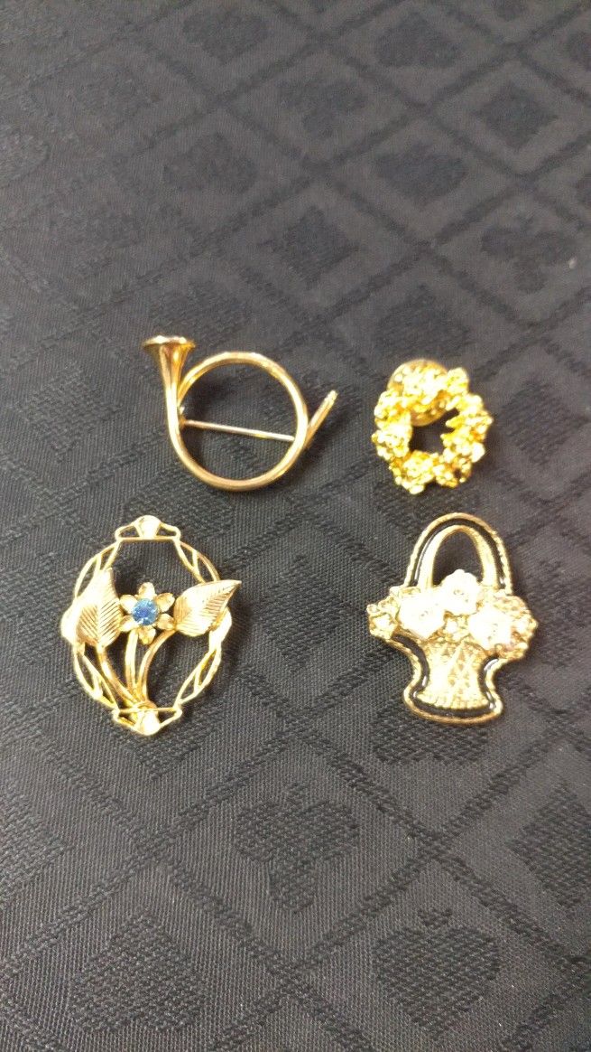 Napier Horn, Gold Plated Wreath of Roses, Goldtone w Blue Stone Flower, Monet Goldtone Flower Basket w Porcelain Flowers. $20.00 cash