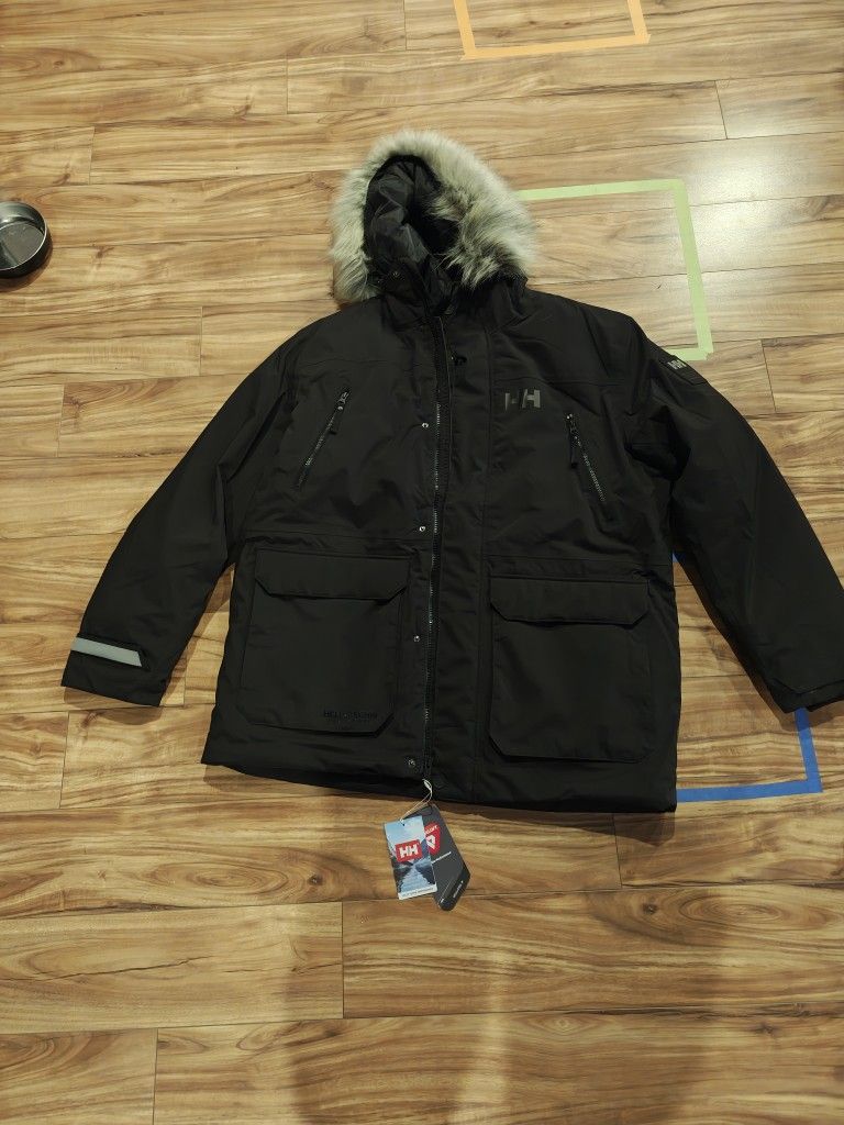 Brand New never worn Helly Hansen Reine Parka, still has the tags. Size Large Black, removable faux fur hood trim, reflective wrist strip that you can hide. I bought a different size but I can attest that it is warm and lightweight for a parka. Retails for $350 plus tax new but it is yours for $300. OBO. Let me know if you have any questions.