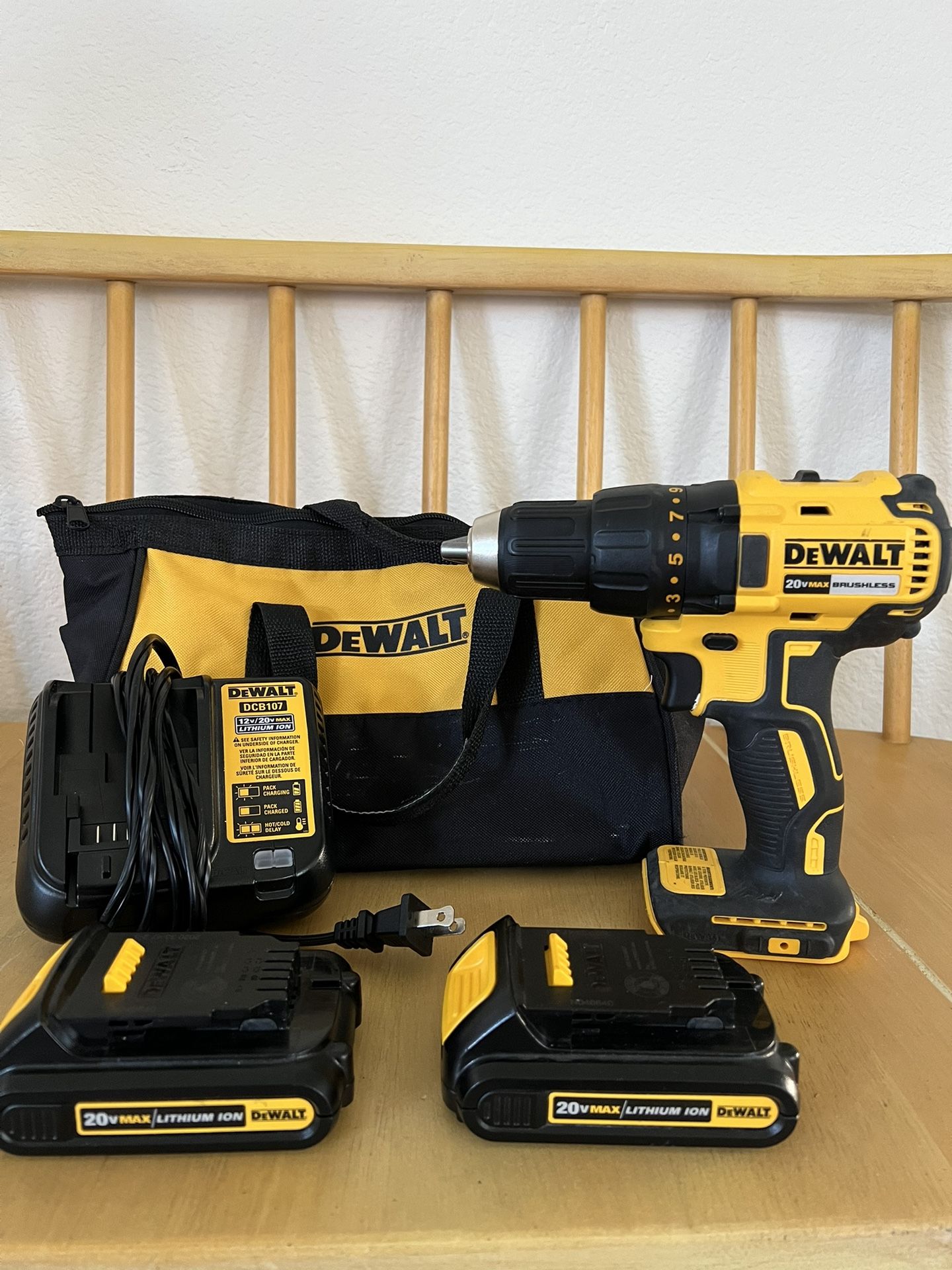 Dewalt Brushless Drill, 2 batteries, Charger, and Contractor Bag