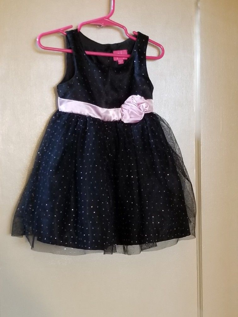 Black dress with pink accents. Pink waist ribbon with flower that ties in the back. Also has small glittery pink dots on the tulle skirt. Size 2T. Smoke free, pet free home. Be sure to check out my other listings!