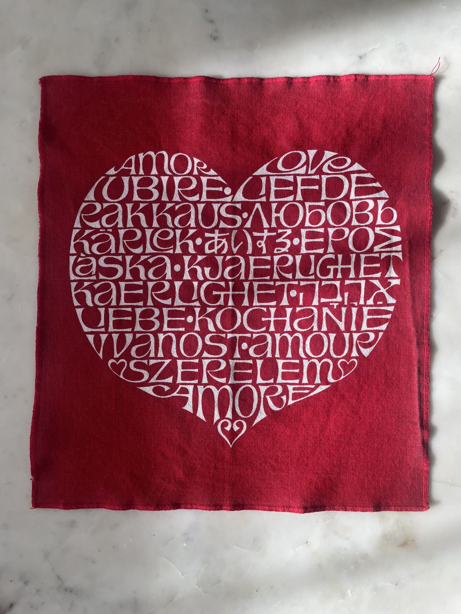 Original "International Heart" unframed textile by Alexander Girard for Herman Miller, c. 1967. Say "I love you" in nineteen different languages. Girard's "International Heart," was made for a very brief period and retired, never to be produced again. The textile fabric is a red cotton canvas with hemmed edges. Approximately 14"W x 15 3/8 "H. Vintage condition. Looks like it has been stored with right side folded and has an indentation folded line that is a tad lighter. Still gorgeous for your Girard art collection! Please view all picture and feel free to message me with any questions. Alexander Girard’s International heart features the word Love in 19 languages. It was designed in 1961 for the Textile and objects shop which Alexander Girard created for Herman Miller.