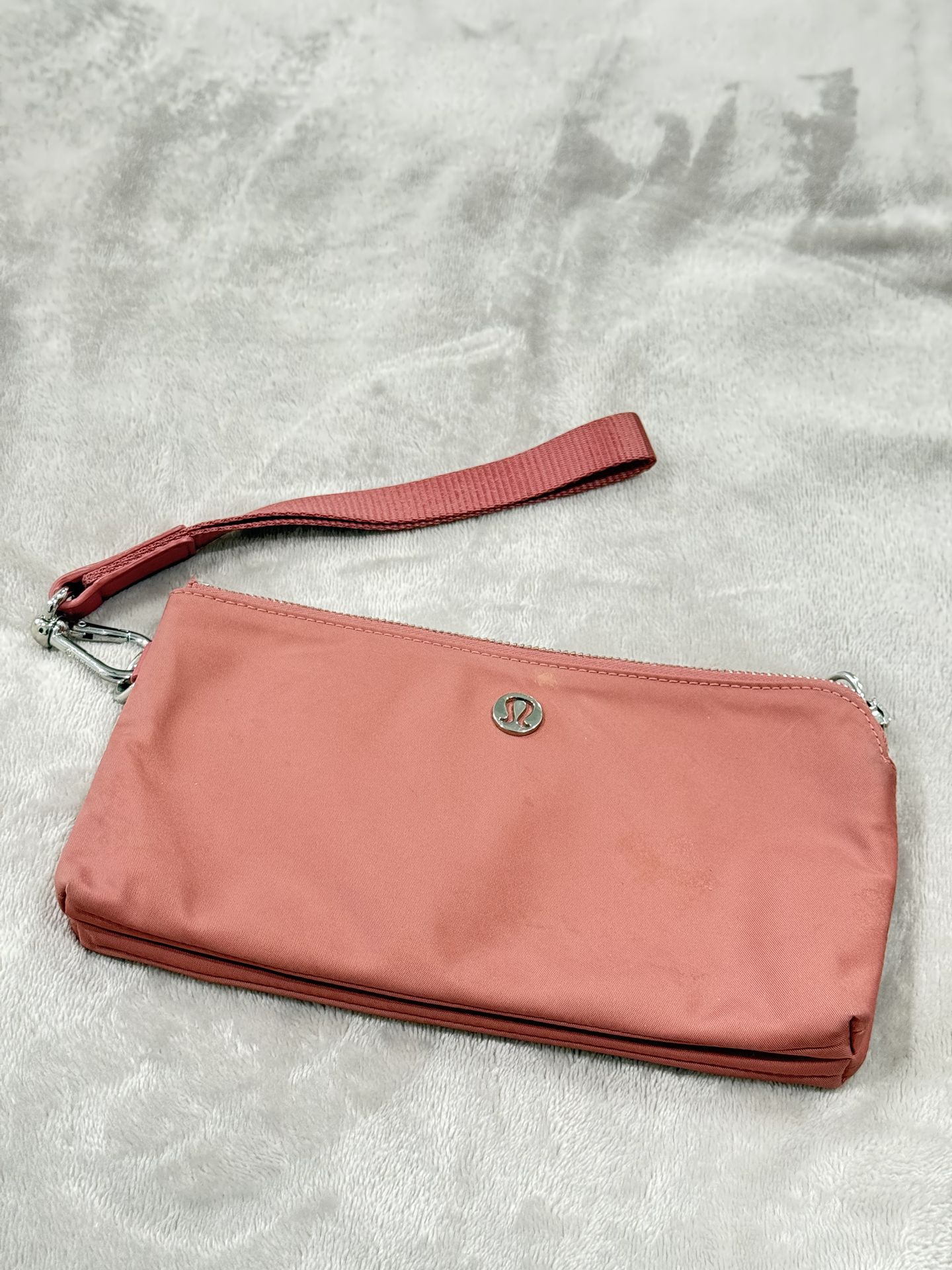 Lululemon zip wristlet in a beautiful coral/salmon color. Lightweight nylon material with silver hardware and detachable strap. Great for: • Gym essentials • Travel • Makeup • Everyday grab-and-go Pre-owned in good condition with normal light wear. No major flaws. Pickup in Dublin