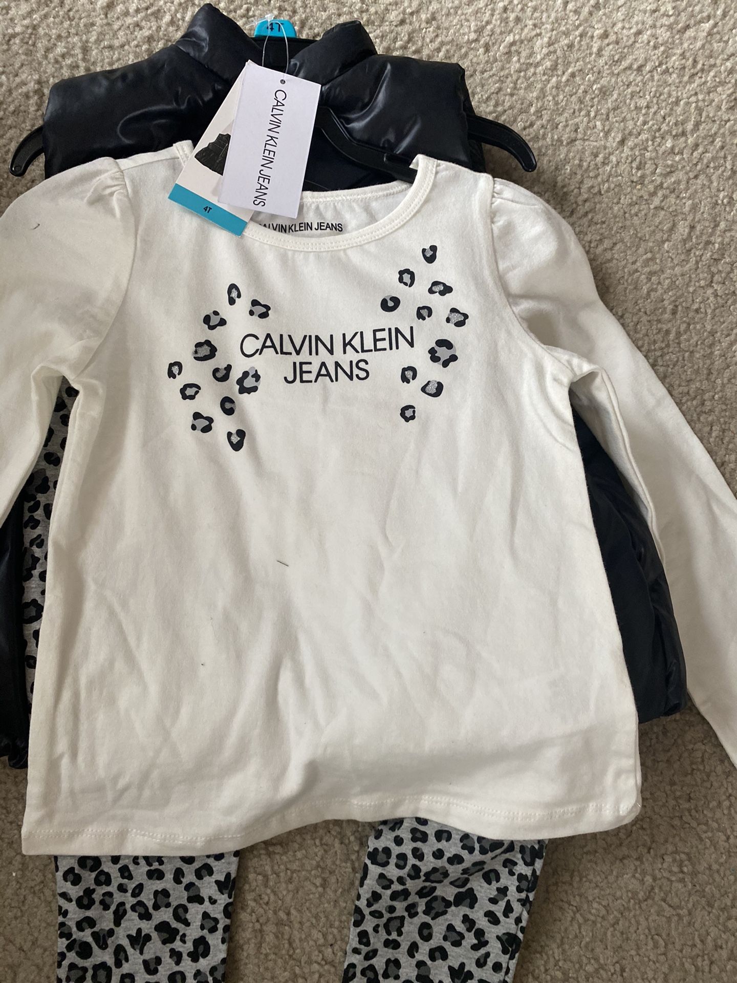 Black vest with leopard print leggings and top-size 4T-$20 Light pink vests with leggings and white top- there are 2 sizes, 4T and 5T-$20 each The vests are warm Brand new with tags, never worn If you have any questions or offers, feel free to ask