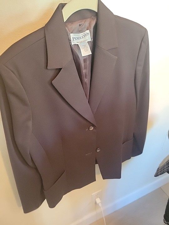 Pendleton Women's vintage Brown virgin Wool Blazer Size 10 This is a Pendleton Women’s Wool Blazer Color: Brown Material: Wool Condition: Preowned. This item has had alterations. Please see measurements in the listing. No major flaws free and clear of any noticeable stains, rips, tears, or pulls of fabric Size: 10 Measurements are taken flat on the table: Excellent condition no rips stains or tares Armpit to Armpit (doubled): 40 inches Jacket length (top of collar to bottom hem): 30 ½ inches Shoulder (across the back): 16 ½ inches Sleeve (from seam to cuff): 23 ½ inches Waist (across waist area doubled): 38 inches.