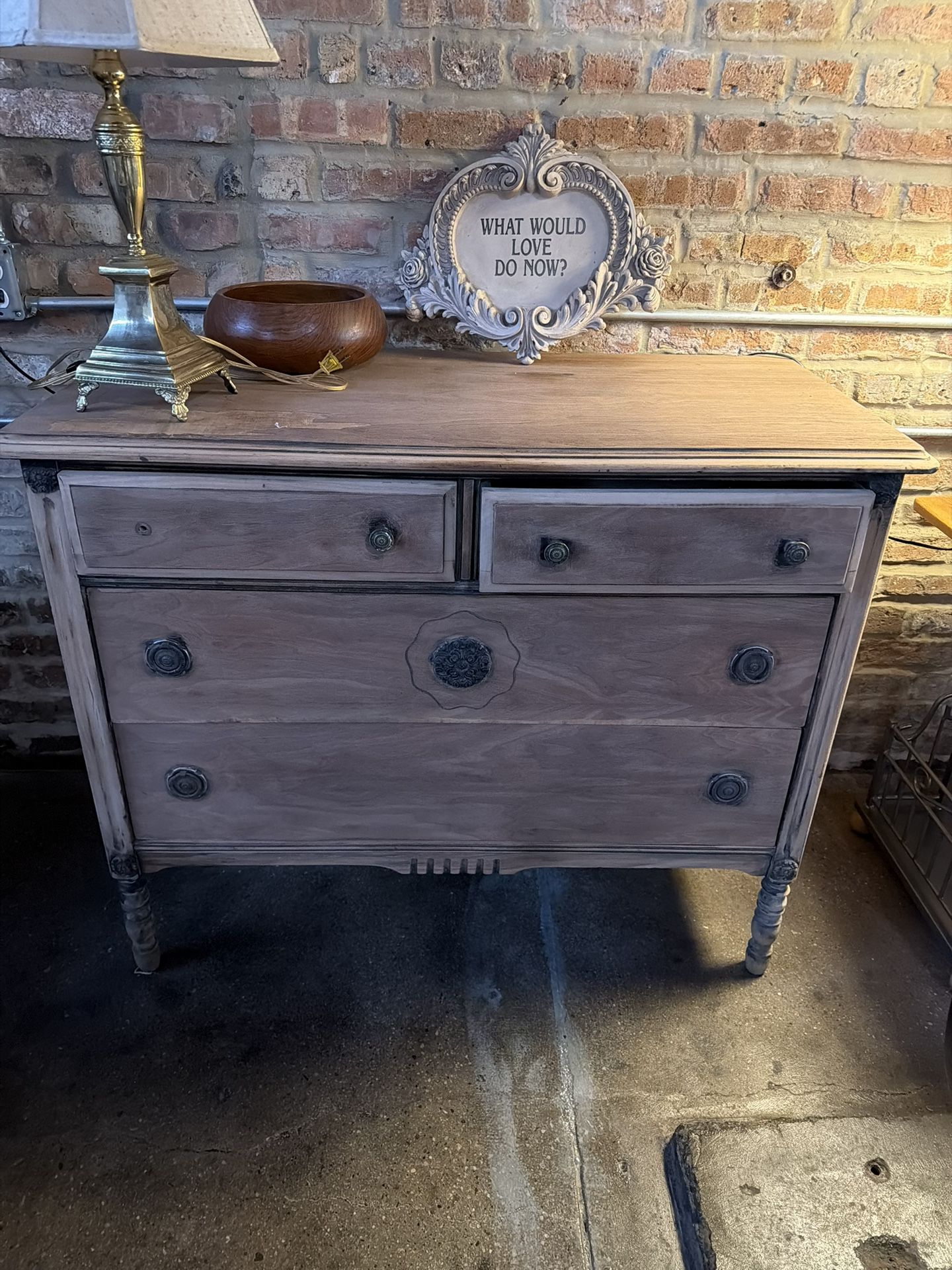 antique wooden dresser with a light, distressed finish and original hardware 42” wide 20.5” deep 34” tall