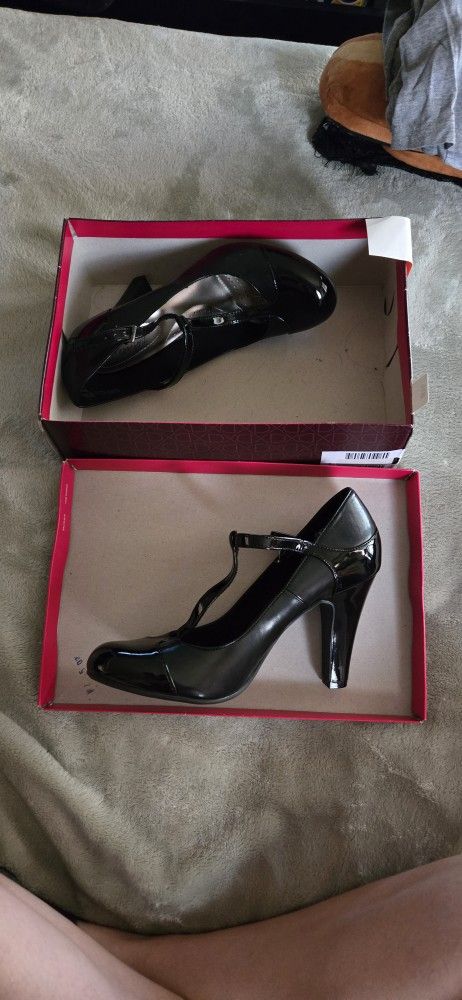Cute strappy glossy black heels with comfort cushion inside size 8.5. believe heel is 3in