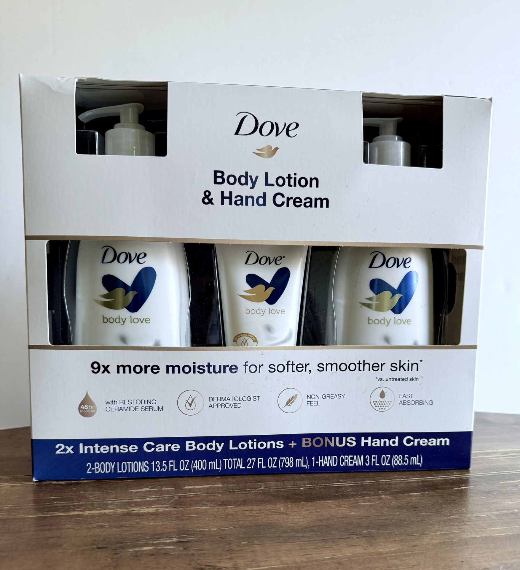 Get ultra-moisturized, softer, and smoother skin with Dove Body Love Lotion & Hand Cream Set • 2 Intense Care Body Lotions (13.5 fl oz each) – Infused with restoring ceramide serum for long-lasting hydration • 1 Bonus Hand Cream (3 fl oz) – Perfect for soft, non-greasy hand care • Benefits: • Dermatologist approved • 48-hour hydration • Fast-absorbing, non-greasy formula for daily use Perfect for gifting or personal care. Take care of your skin with Dove’s trusted quality and nourishment #DoveBodyLove #BodyLotionSet #HandCream #SkinCareEssentials #Hydration #MoisturizingSet #DoveGiftSet INTENSE CARE FOR DRY SKIN: Give your body the love and care it deserves with Dove Intense Care body lotion for softer, smoother, healthier-looking skin with every application RETAINS 9X MORE MOISTURE THAN UNTREATED SKIN: Beautifully nourishes dry skin and provides long-lasting, 48-hour moisturization INFUSED WITH RESTORING CERAMIDE SERUM: The unique blend of ingredients in Dove Intense Care body lotion is designed to replenish ceramides with nutrients that strengthen the skin's moisture barrier DERMATOLOGIST-APPROVED: This fast-absorbing, non-greasy, and paraben-free moisturizer provides long-lasting care for dry skin MAKE EVERY BODY CARE MOMENT COUNT: Use this body lotion after a bath or shower with Dove Deep Moisture Body Wash for softer and smoother skin that lasts SKIN CARE THAT GOES FURTHER: 100 percent Recycled bottles. PETA Cruelty-Free. Globally, Dove does not test on animals