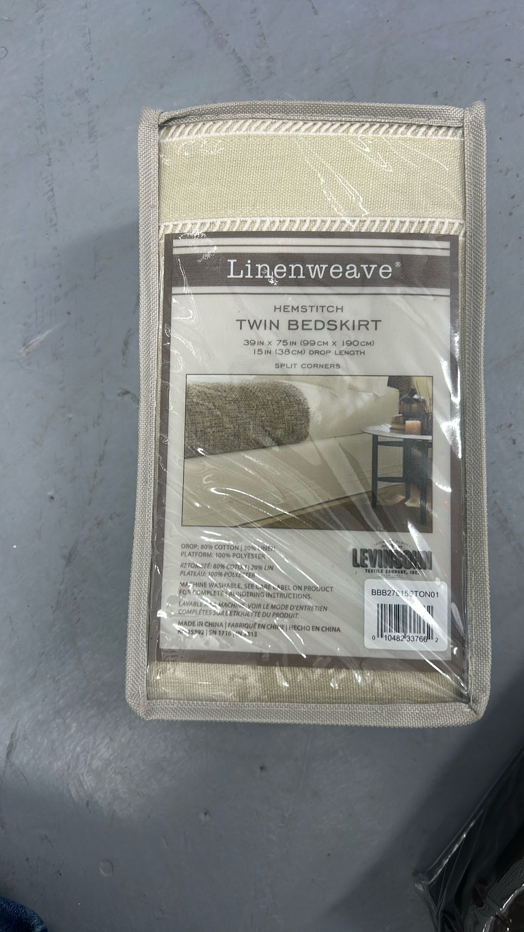 This bed skirt is hemstitched. It is a size twin 15 inch drop length split corners. It is 39 x 75 drop is 80% cotton linen is 20% polyester 100% machine washable made in China.