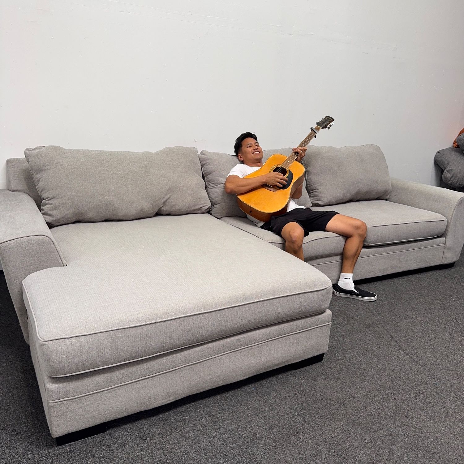 Great Condition. Its HUGE. Light Gray Color. 70% Off compared to retail - Deep Cleaned - The chaise is a like a Bed, its 52” wide - Overall the sofa is 11.5 x 6 FT. All covers can be removed for easy washing. I’m 5’7” tall for your reference. We can drop off and setup