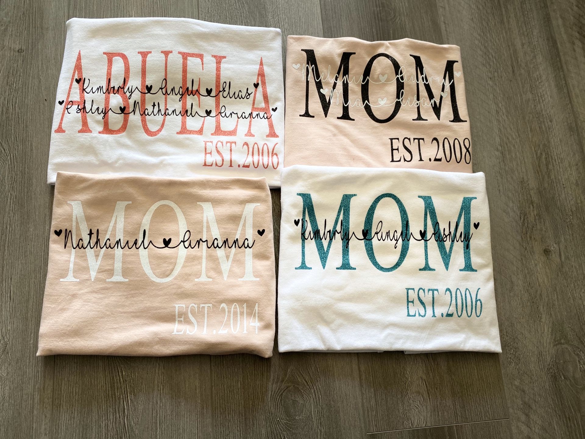 Personalized Mothers Day shirts can make any color, can have any saying that you want. Prices start at $14 and up depending on what you would like on your shirt. Feel free to message me for any questions. Your also welcome to provide your own shirt starting at $8 and up. Follow my IG : ariscreations19 Se Habla Español