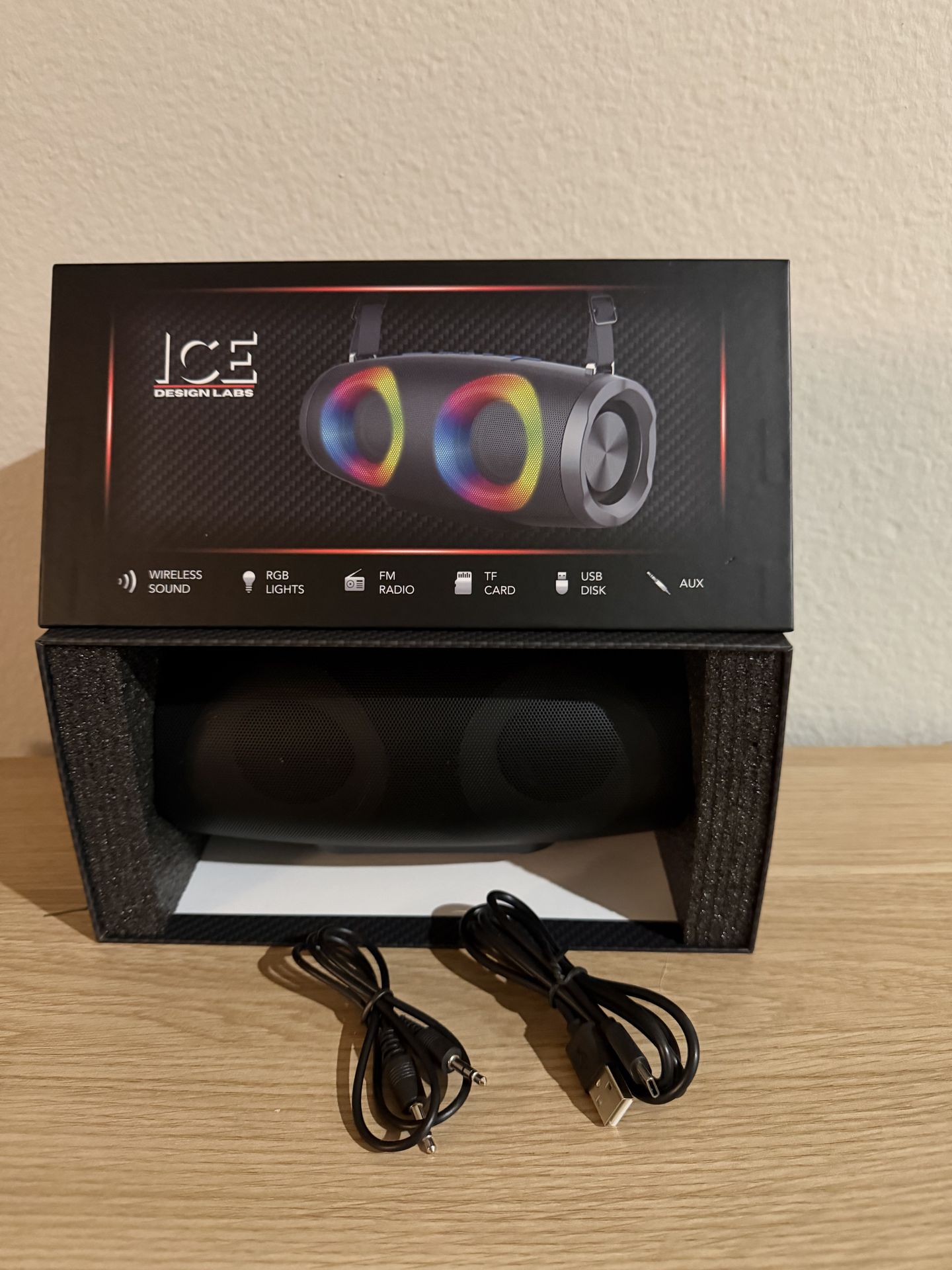 Brand new portable wireless speaker, never used. Comes in original packaging with charging cable and AUX cord included. Features: • Bluetooth wireless sound • Colorful RGB LED light rings (great for parties or ambiance) • FM radio capability • TF card (microSD) slot • USB input • AUX input • Portable design with carrying strap Perfect for indoor or outdoor use—great sound with eye-catching lights. Just open box for photos, otherwise unused.