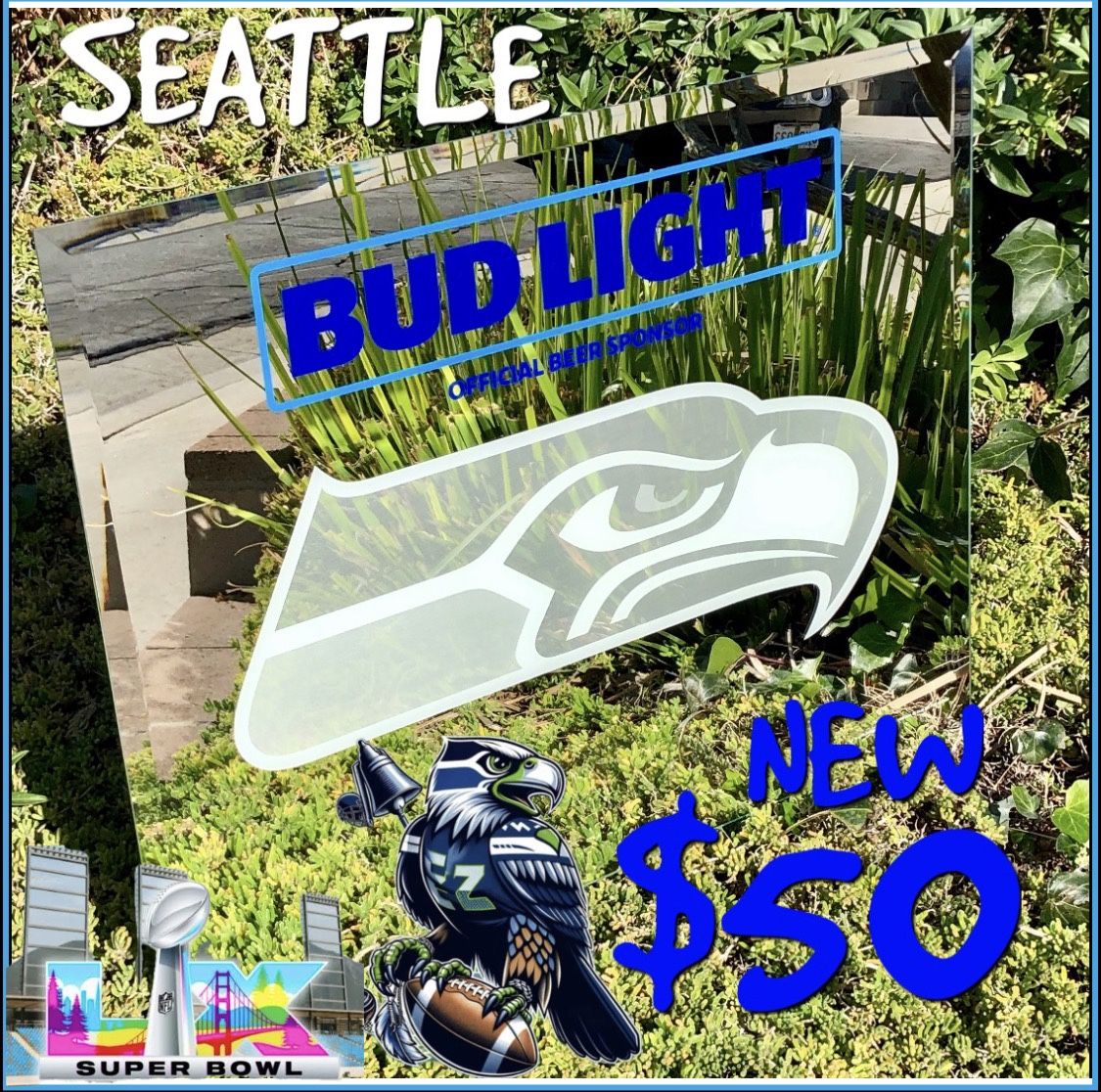 NEW BUD LIGHT SEATTLE SEAHAWKS NFL FOOTBALL BEER BAR REFLECTIVE MIRROR 28β x 22β inches $50 π₯ (PRICE FIRM) This mirror is new