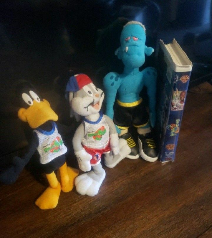 Set of 3 Original "Space Jam" Plush Figures with the Original Vhs Movie.. starring Michael Jordan & his Friends.. Includes Daffy duck, Bugs Bunny & Monstar alien plush dolls.. Movie Works Great! All Plush dolls are in Excellent Condition! Regardless of date posted, if its on my page then its still available! Don't forget to check out my other posts!!