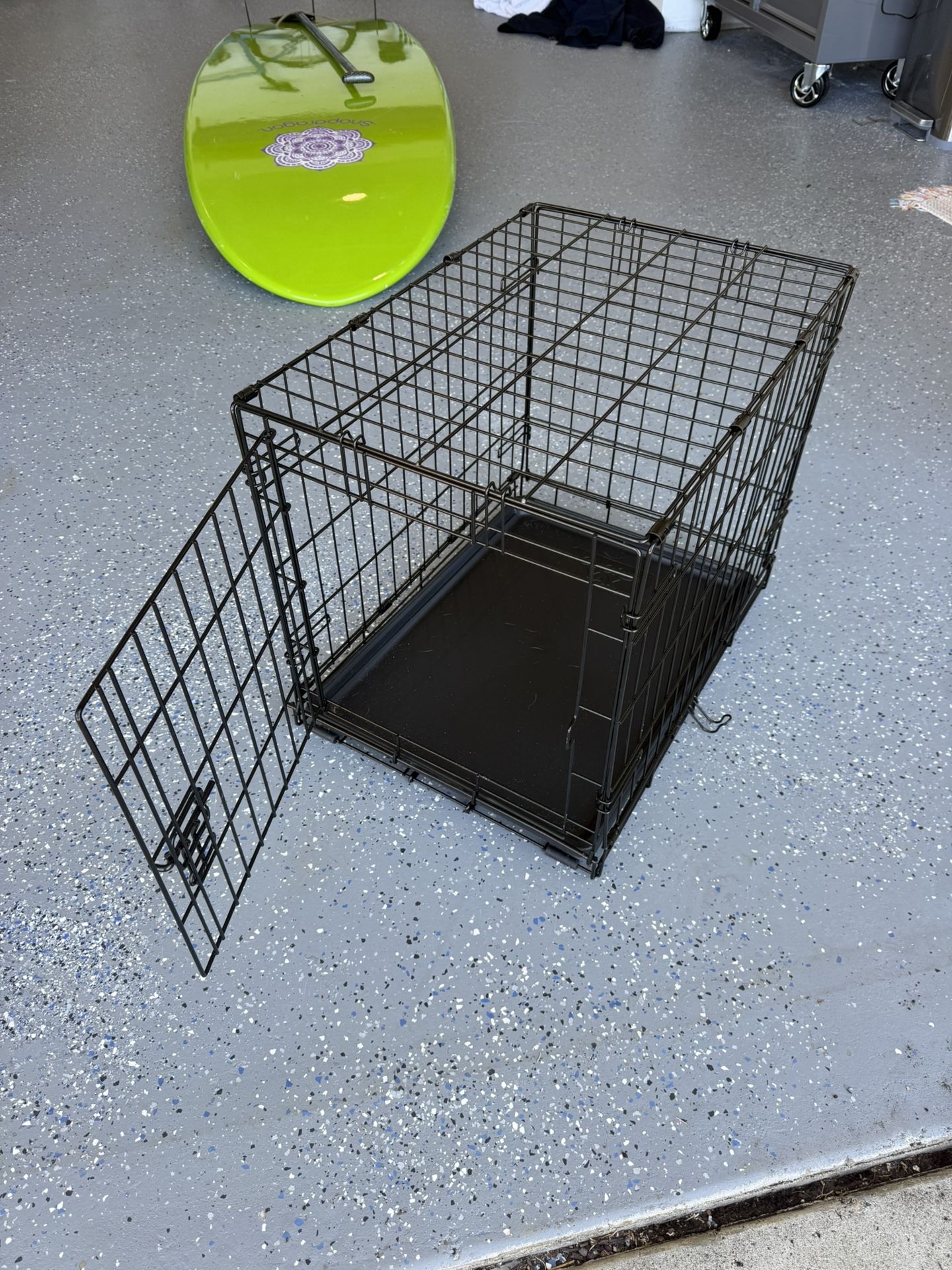 Like new wire dog crate. Only used briefly — my dog outgrew it. • Size: 24" L x 17" W x 19" H • Fits small to medium dogs • Front door with secure latch • Removable plastic tray for easy cleaning • Folds flat for storage or travel • Very sturdy metal wire construction Great for crate training, travel, or creating a safe space for your dog. Located in Carlsbad. Pickup only.