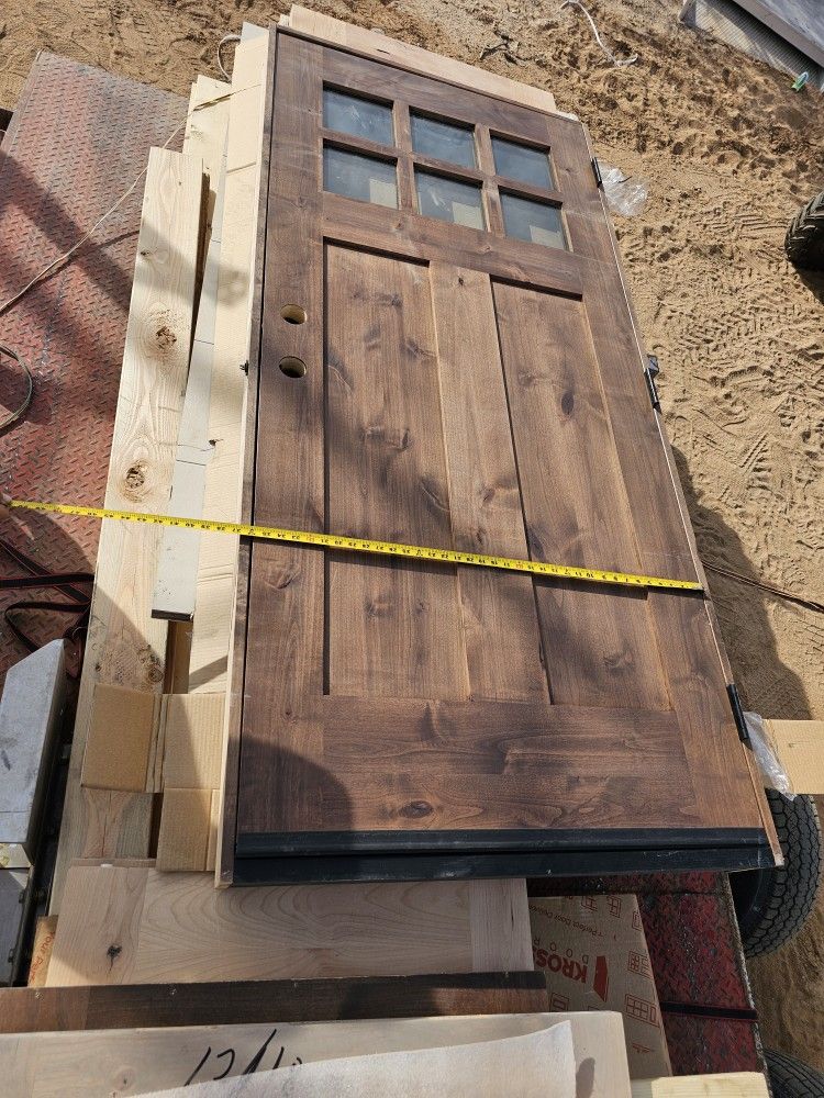 Beautiful solid wood exterior door in great condition. Rustic stained finish with a 6-pane window at the top that lets in natural light while keeping privacy. Heavy, well-built door — not hollow. Details: Approx. 36” wide x 80” tall (see photos with tape measure) Solid wood construction Pre-drilled for handle and deadbolt Dark rustic stain, farmhouse / cabin / craftsman style Glass panes intact, no cracks Condition: Very good overall Minor cosmetic wear from storage (nothing structural) Perfect for a home entry, cabin, workshop, ADU, tiny house, or remodel project. Pickup only Located in Tucson Cash preferred