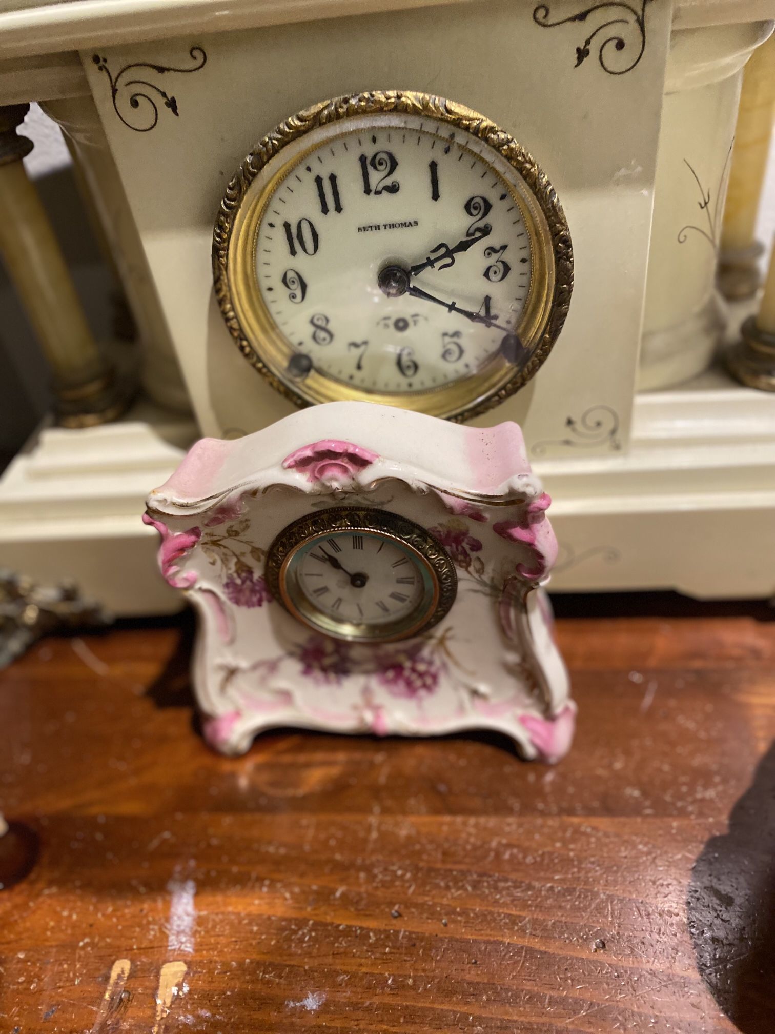 Beautiful Antique Porcelain Ansonia Wind Up Mantle Clock. Non Working. Made in Germany. 6x6 inches. Pretty Clock