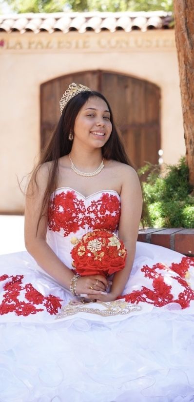 beautiful bling out Only use for a one hour mass and photos taken at the Church only therefore it only has only a couple hours usage.This is a beautiful dress it has been customized with lots of rhinestones it comes with the under skirt it was only wore one time but not on the dance floor it was professionally cleaned original price of the dress $1200