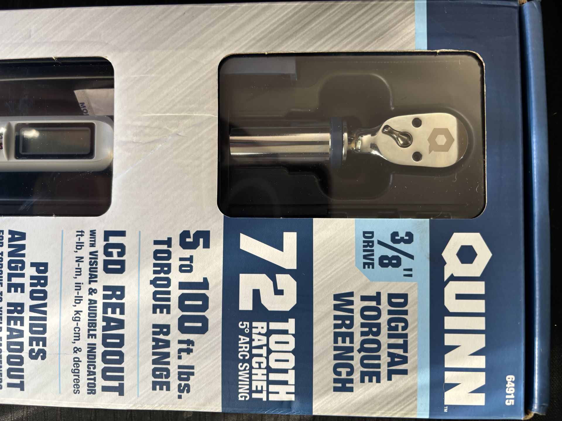 Brand new, factory-sealed Quinn Professional 3/8" Drive Digital Torque Wrench. This is a major upgrade over standard "click" style wrenches, offering digital precision and an integrated angle gauge. Perfect for engine builds, spark plugs, and suspension work. Key Features: • Wide Range: 5 to 100 ft-lb (also measures in Nm, in-lb, kg-cm, and degrees). • Angle Mode: Built-in angle readout for torque-to-yield fasteners—no need for separate angle gauges. • Accuracy: Professional standard +/- 3% (clockwise). • Alerts: Clear LCD display with audible beeps and LED lights that signal when you hit your target. • Storage: Program and save up to 9 preset torque values for repetitive tasks. • Compact Design: 72-tooth ratchet with a 5° arc swing for tight spaces. Includes: Protective molded storage case and (2) AA batteries.