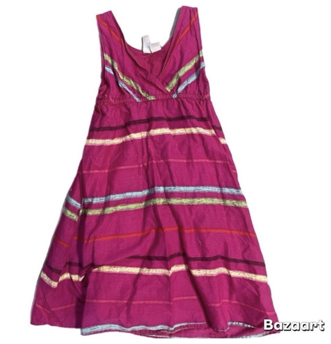 This product is a stylish summer dress for girls in size 6. The dress features a sleeveless design with a halter neckline, making it perfect for warm weather. The pink striped maxi dress from Old Navy is easy to wear with a pullover closure, and the knee length cut is ideal for the summer season. Perfect for casual outings or parties, this dress is a fun and fashionable addition to any young girl's wardrobe. Pre owned.