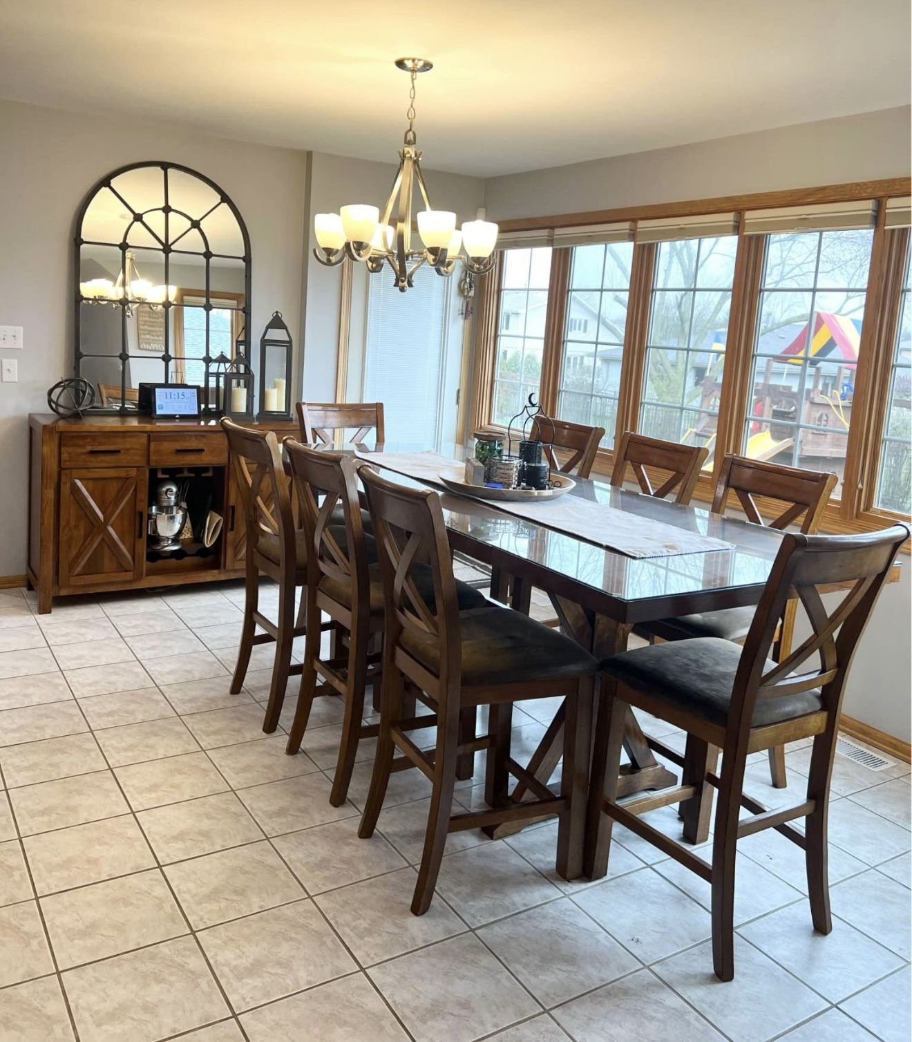 Hi Top Table 95 inches length and 42 inches wide (with extension in, extension included) , 8 chairs, and Server being sold together. Table top in great condition, and chairs In fair condition, seat cushions can be cleaned, however selling as is. Some chairs need tightening. Some light scratches on chairs and table. Top of server has a small scratch, but besides that good condition. Also has a glass top (glass top included). This was purchased as a set and is being sold as a set. Decor and Mirror also not included. Willing to sell table and chairs separate from server.