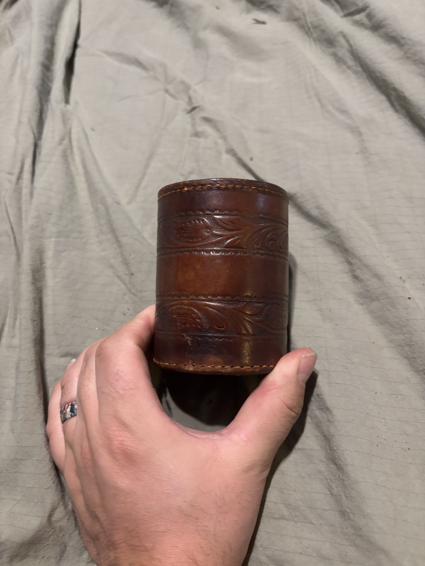 Nice vintage leather cup/utility holder with detailed tooling and stitching. Solid and functional with great character. Perfect for small tools, pens, grooming items, or rustic décor. Some wear from age, adds to the vintage look. Pickup or shipping available. Open to reasonable offers.