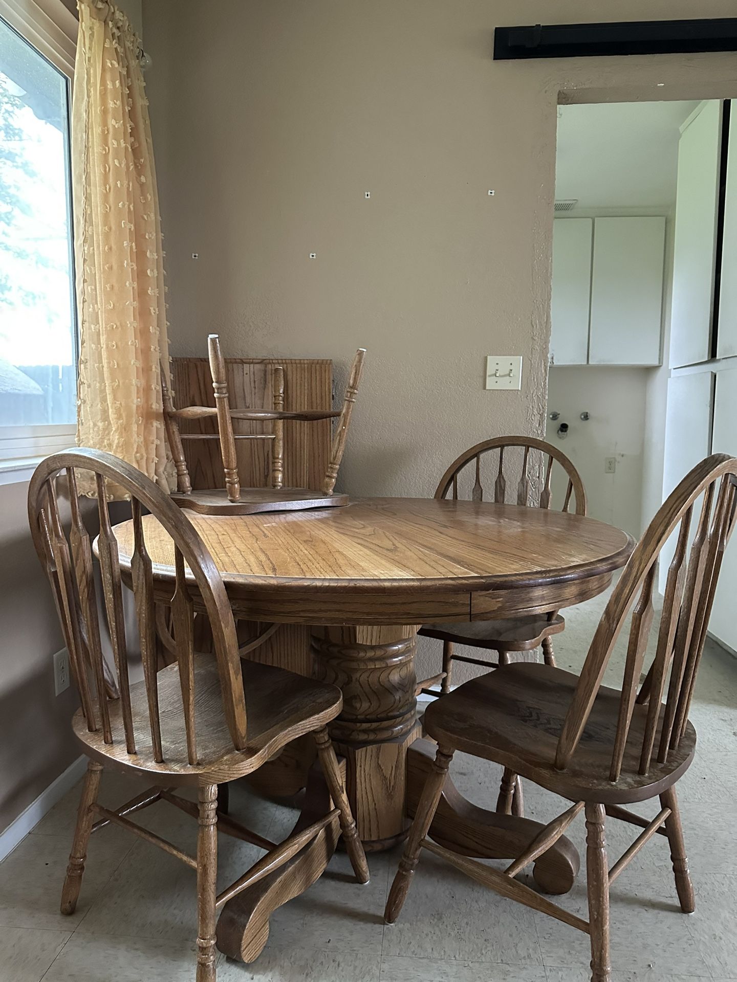 I’d like to sell this table. I’m moving and no longer have room for it. It comes with 4 matching chairs and a table leaf (full table is 6’ with leaf). Minor scuffs from normal wear, but otherwise in great condition.