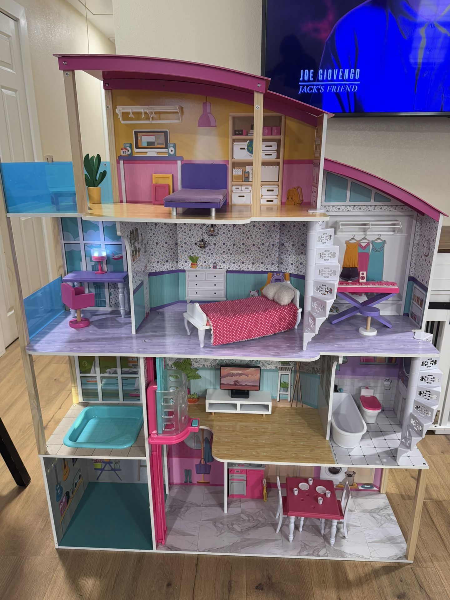 Wooden Doll House for Sale •Used-like new. •Very good condition •Comes with adjustable slide and a bigger doll pool. •Includes Elevator and mini pool. •Includes furniture and other appliances for doll house. • Toys have sound and turn on. DM if interested and for better negotiation. Se habla español.
