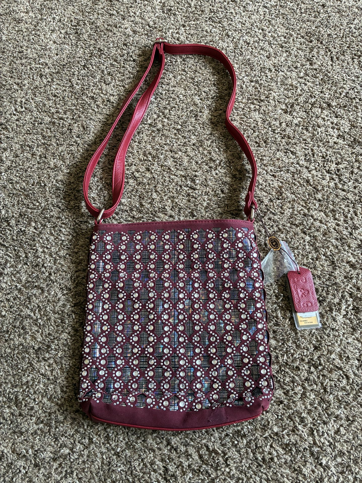 P&G Collection Crossbody or Shoulder bag Never Used - Tags Attached Burgundy leather with silver accents Adjustable strap 10” long; 9 1/2” wide; 15” long strap Some small spots - see pictures