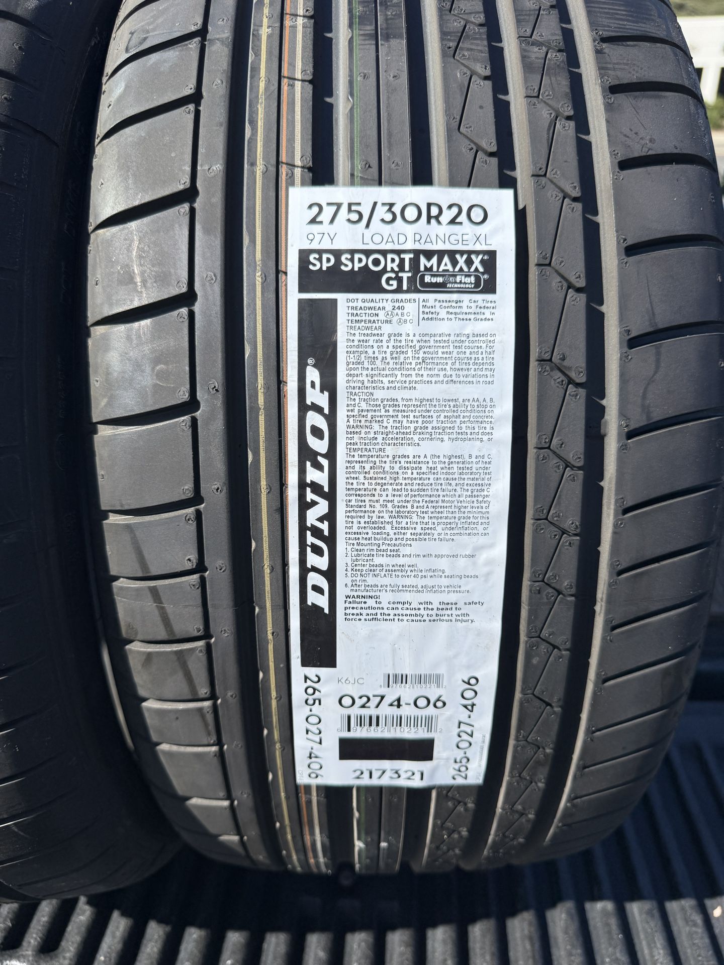 BMW 550i Tires 275/30/20 Dunlop Sport GT DSST RunFlat/ BRAND NEW $200.00/EACH