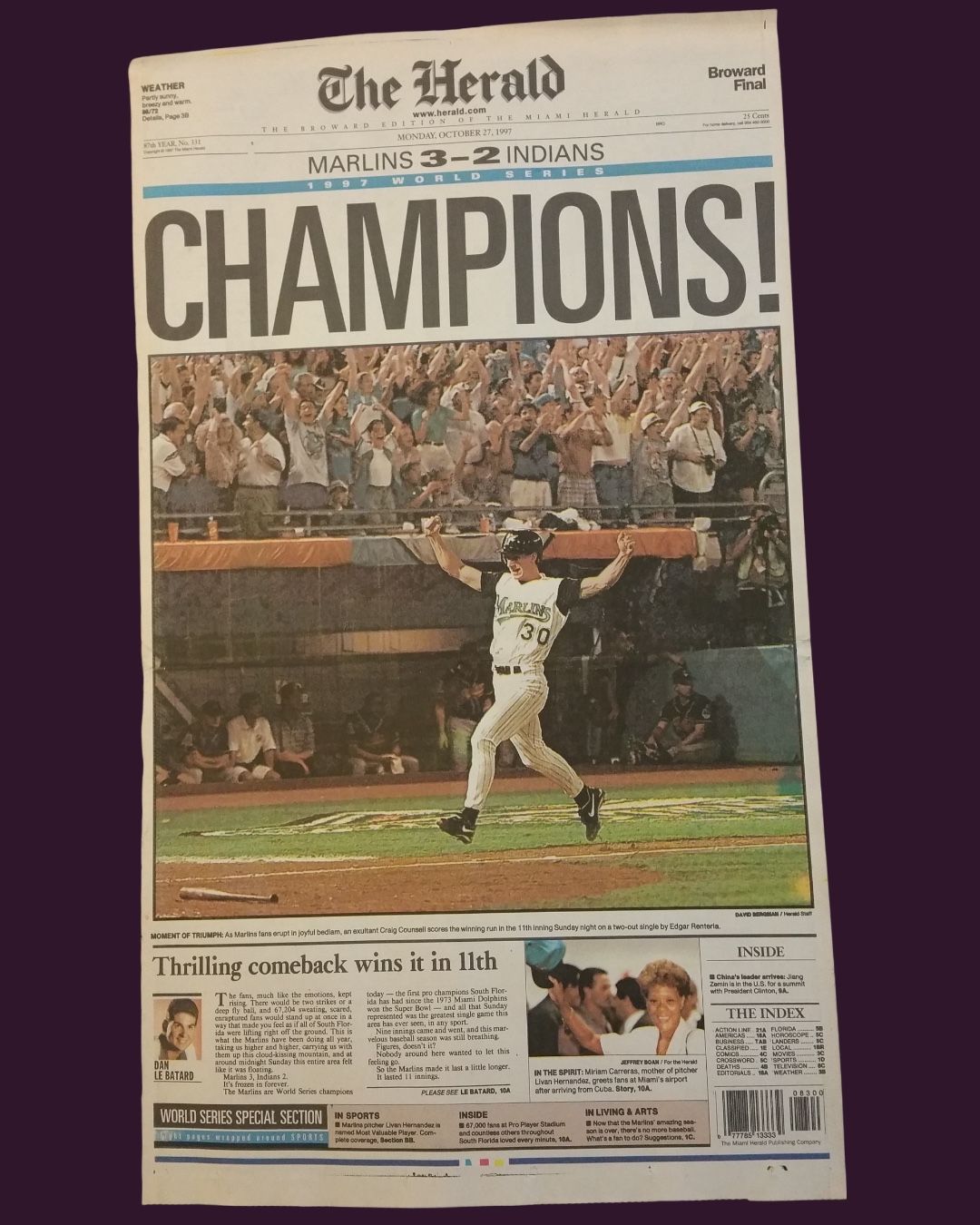 Original Miami Herald front page, dated Monday, October 27th, 1997, celebrating the Marlins first World Series Championship. * THIS IS NOT A COPY, IT’S THE ACTUAL 29 YEARS OLD ORIGINAL NEWSPAPER PAGE *