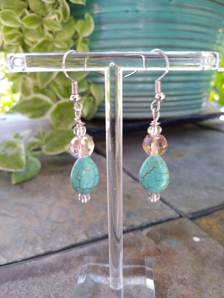 Turquoise - Pink Crystal - Handmade Glass Bead Earrings! Beautiful turquoise, and crystal beads that reflect the light, silver color stainless steel ear wires! Very lightweight, and can be worn everyday! Be sure to remove at night, and when you shower, to care for your jewelry. Cash only if picked up in Brighton, CO. Check out my other listings!