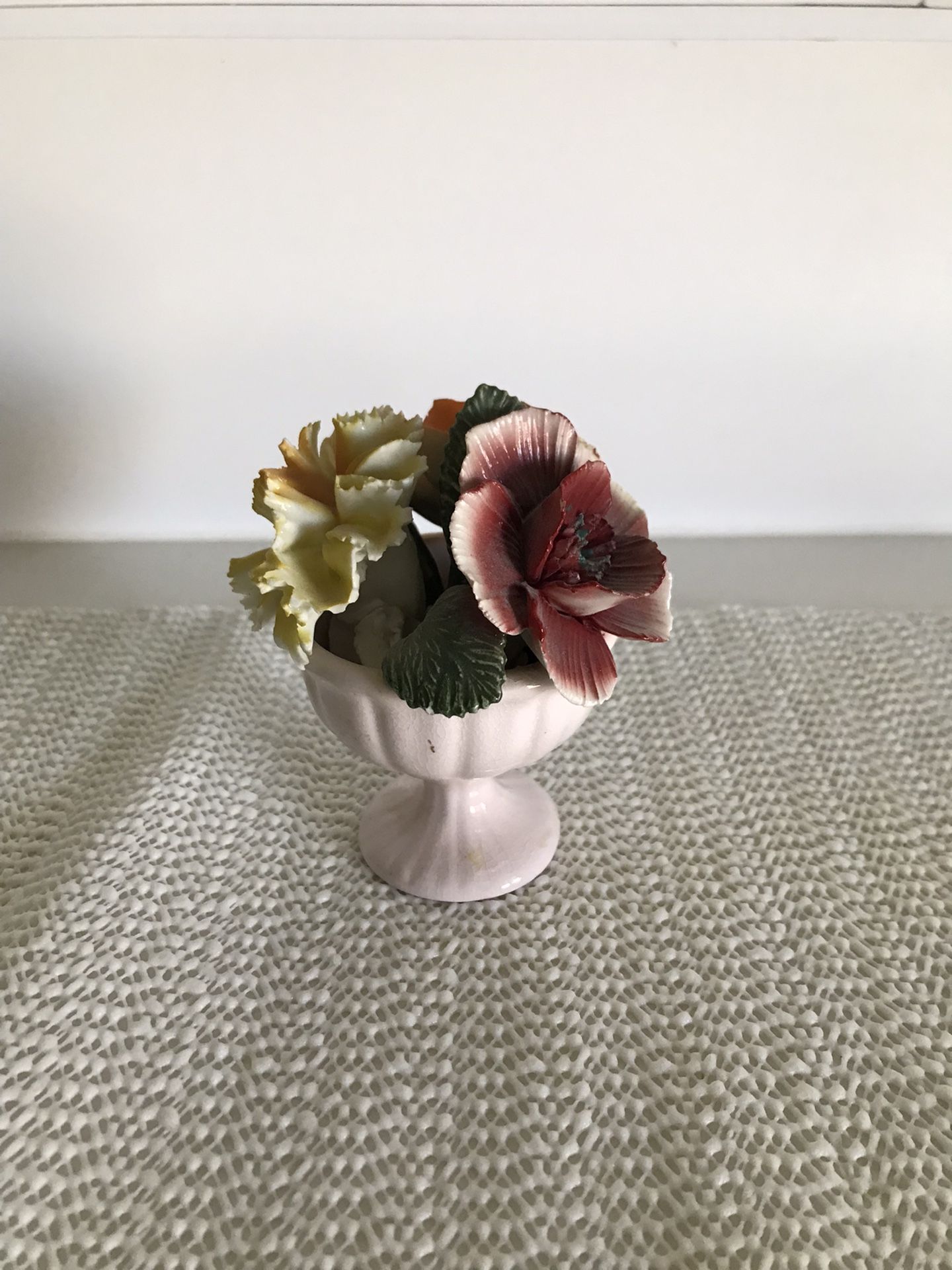 Pink, orange, and yellow flowers in an off-white vase. 3-1/2” tall by 2-1/2” wide. Made in Staffordshire England. Firm on price. Great Mother’s Day gift idea!