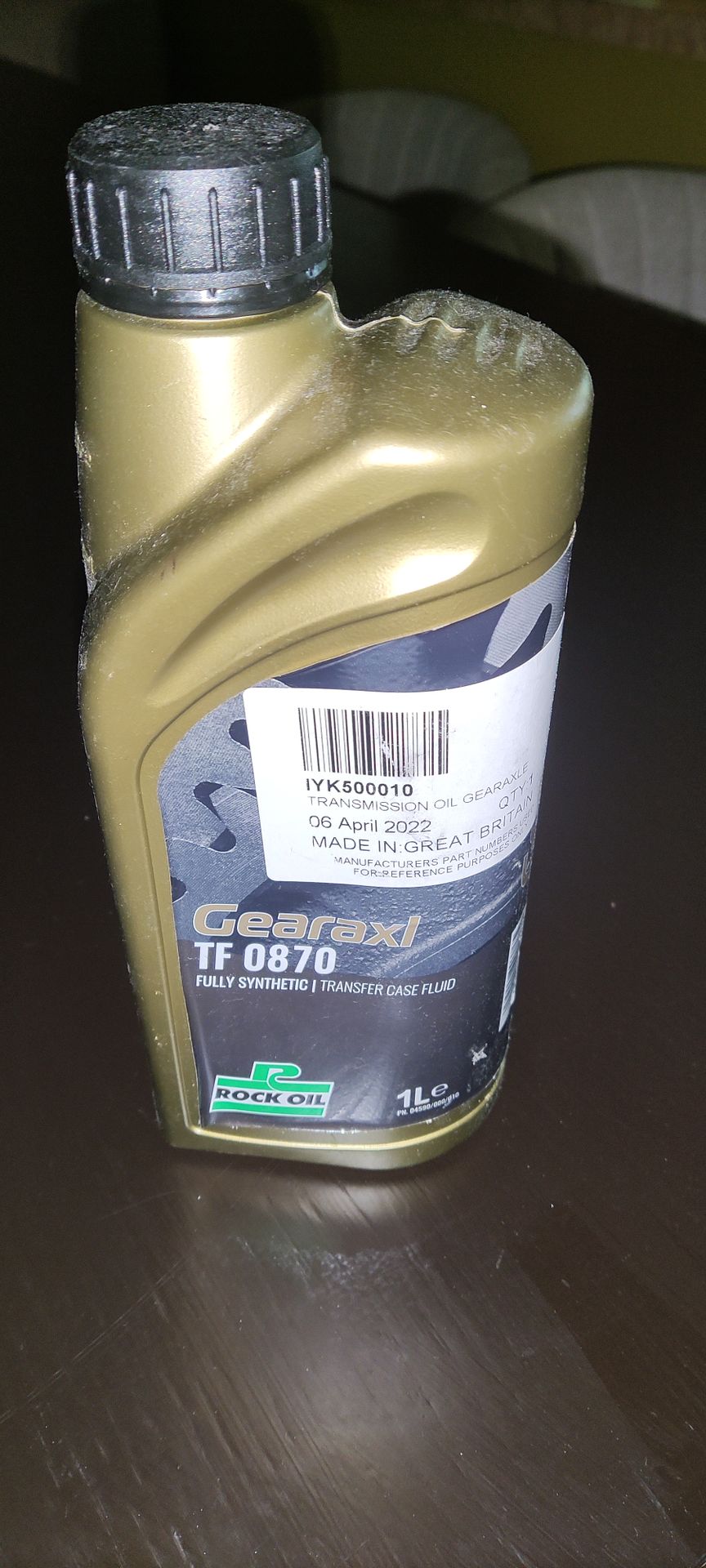 Product Details and Specs Gearaxl TF0870 is formulated and manufactured in the UK by premium automotive fluid specialists, Rock Oil, to exceed Original Equipment (O.E.) factory fill specification. Since 1928, Rock Oil has been Europe's premium manufacturer of automotive oils and fluids. Gearaxl TF0870 is a fully synthetic gear lubricant for the latest generation of electronically controlled active transfer case gearboxes and ensures optimum power transmission on your Land Rover or Range Rover (and other makes as well.) It offers superior lubricating ability, even at very low temperatures in winter. Technical Characteristics and Features: 1 liter / 1.06 quart bottle Excellent lubricating ability even at low temperatures A high, stable viscosity index Excellent oxidation stability Protection against wear, corrosion, and foam formation Balanced formulation for excellent low coefficient of friction Neutral towards sealing materials Neutral behavior by inhibition compared with non-ferrous metals Rock Oil Gearaxl TF 0870 Fully Synthetic Meets or Exceeds These OEM Equivalents*: Land Rover IYK500010, LR003137 BOT 118 Plus, ATF TF-0753 BMW DTF-(contact info removed)0, (contact info removed)4, (contact info removed)6, (contact info removed) for X-Drive Transfer Case: ATC300, ATC350, ATC400, ATC450, ATC500, ATC700 Nissan 999MP-TF0870P, KLD22-00001EU for Transfer Case ATX90A Porsche 000-43-301-36 / 0000(contact info removed) for Cayenne Transfer Case Volkswagen Audi G052515A2 / G055015A2 for Transfer Case 0AD and 0BV on VW Touareg, and Audi Q7, G052533A2 for Transfer Case 0C7 for Amarok, G052536A2 for Touareg, Amarok, Q7) *Always consult your service manual and confirm the specific fluid and oil requirements for your model. Free 1-5 Day Delivery Most orders usually arrive on your doorstep in 3 days or less, for free. Hassle-Free Returns Not sure? Don't worry, we offer hassle-free 30 day returns on everything. Low Price Guarantee We have the best price on over 11,000 parts, guaranteed. If not, we'll match it. In-House Experts Questions? We have over 40 years of Rover parts experience! Message us.
