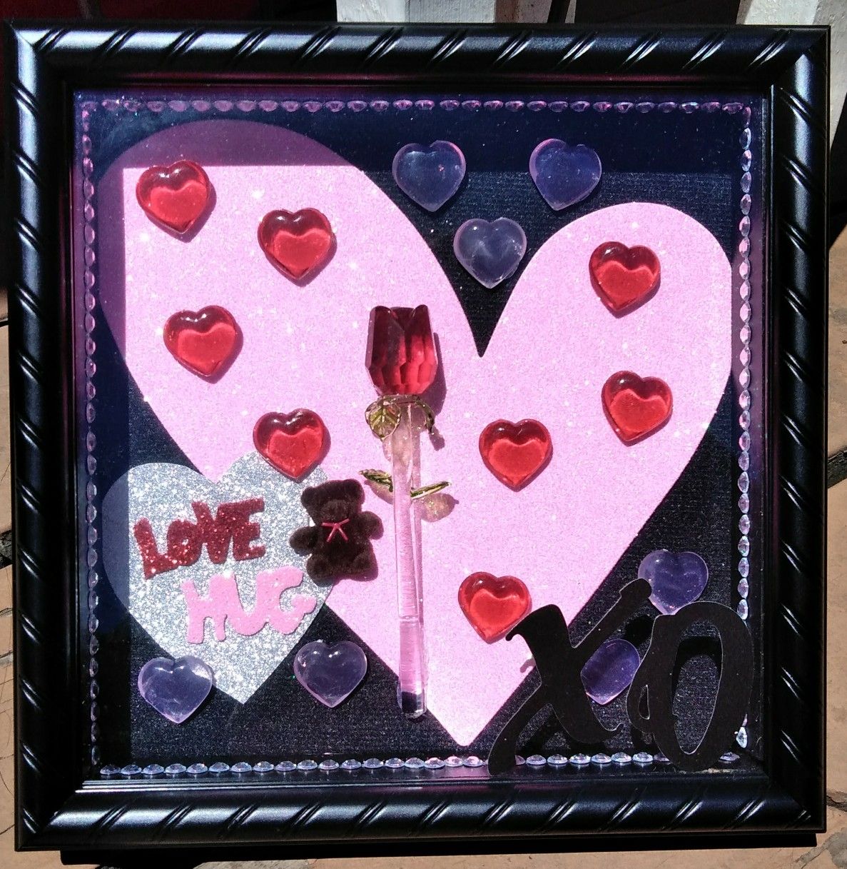 Homemade Shadow Box with glass rose and mini teddy bear. 9x9in. Perfect for Valentine's Day!