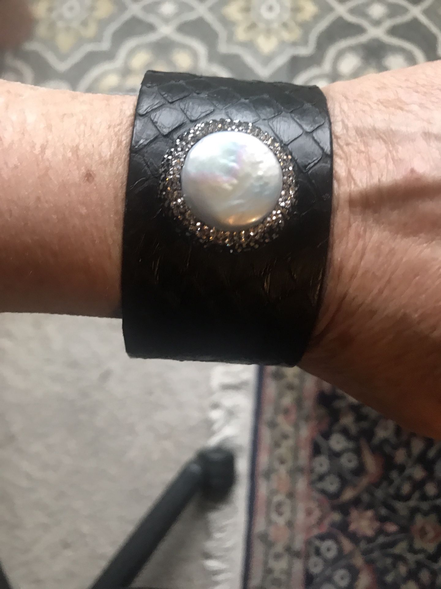 Fabulous pearl bracelet wrapped in marcasites leather band adjustable