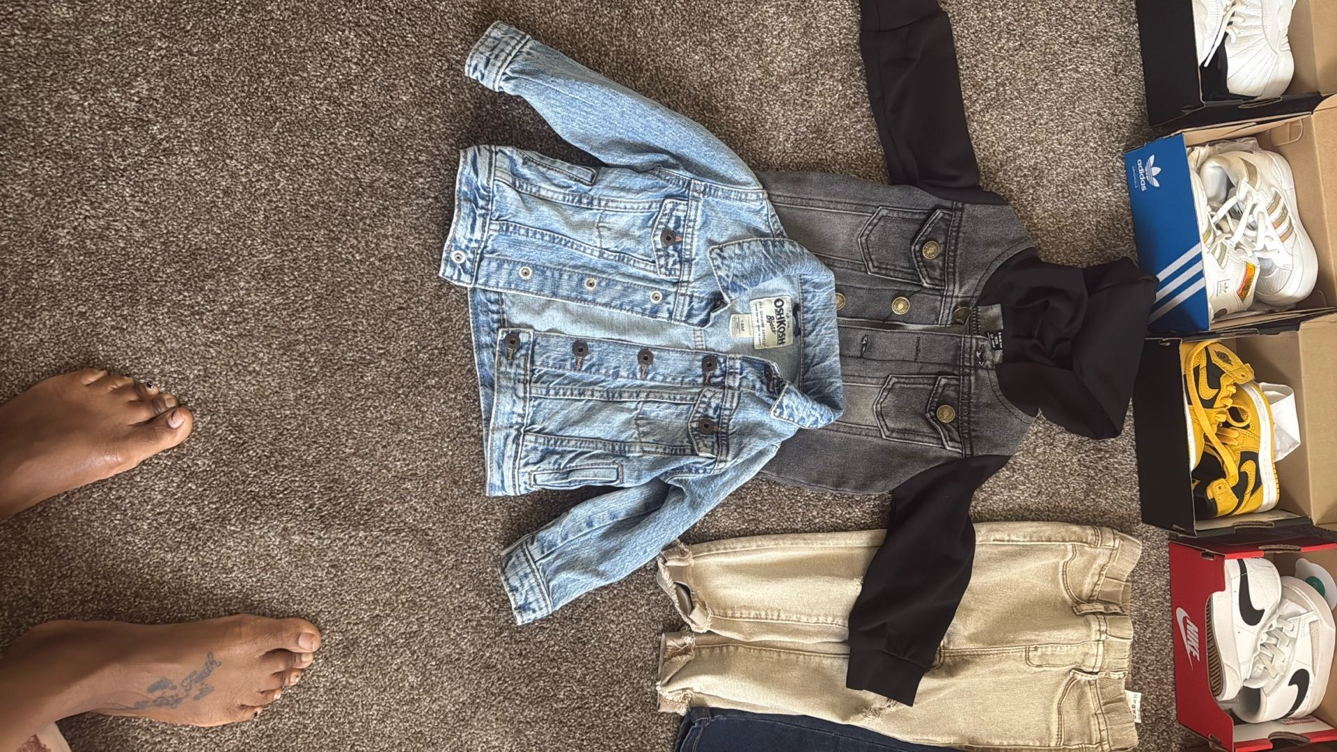 Willing to negotiate prices. Doesn’t have to be bought as bundle. Pink & Gray NB size 9 Black & White Jordan 12 Retro size 4c White, Black, & Red Jordan 12 Retro size 4c Black & White Panda Dunks size 6c Iridescent Hardcourt HI Adidas size 6c Navy Blue, White, & Gray Jordan 3 Retro size 5c Pollen Yellow, Black, & White Jordan 1 Retro High OG size 4c White & Black Nike Blazer Mid ‘77 size 5c White Concord, Blue Lagoon, & Black Jordan 10 Retro size 6c White, Fire Red, & Black Jordan 4 Retro size 5c Summit White, & Black & Summit Noir Jordan 9 Retro size 5c Black Bordeaux Jordan 6 Retro size 4c LeBron XVIIII Low size 4c (Space Jam Edition) Racer Blue & White LeBron XVIIII Low size 4c (Space Jam Edition) White & Blue Air Force size 4c (Space Jam Edition) Black Denim Jacket size 18m Tan jeans 18-24m Blue Denim Jacket size 18m Blue fashion Jeans size 12-18m Tan jeans 12-18m