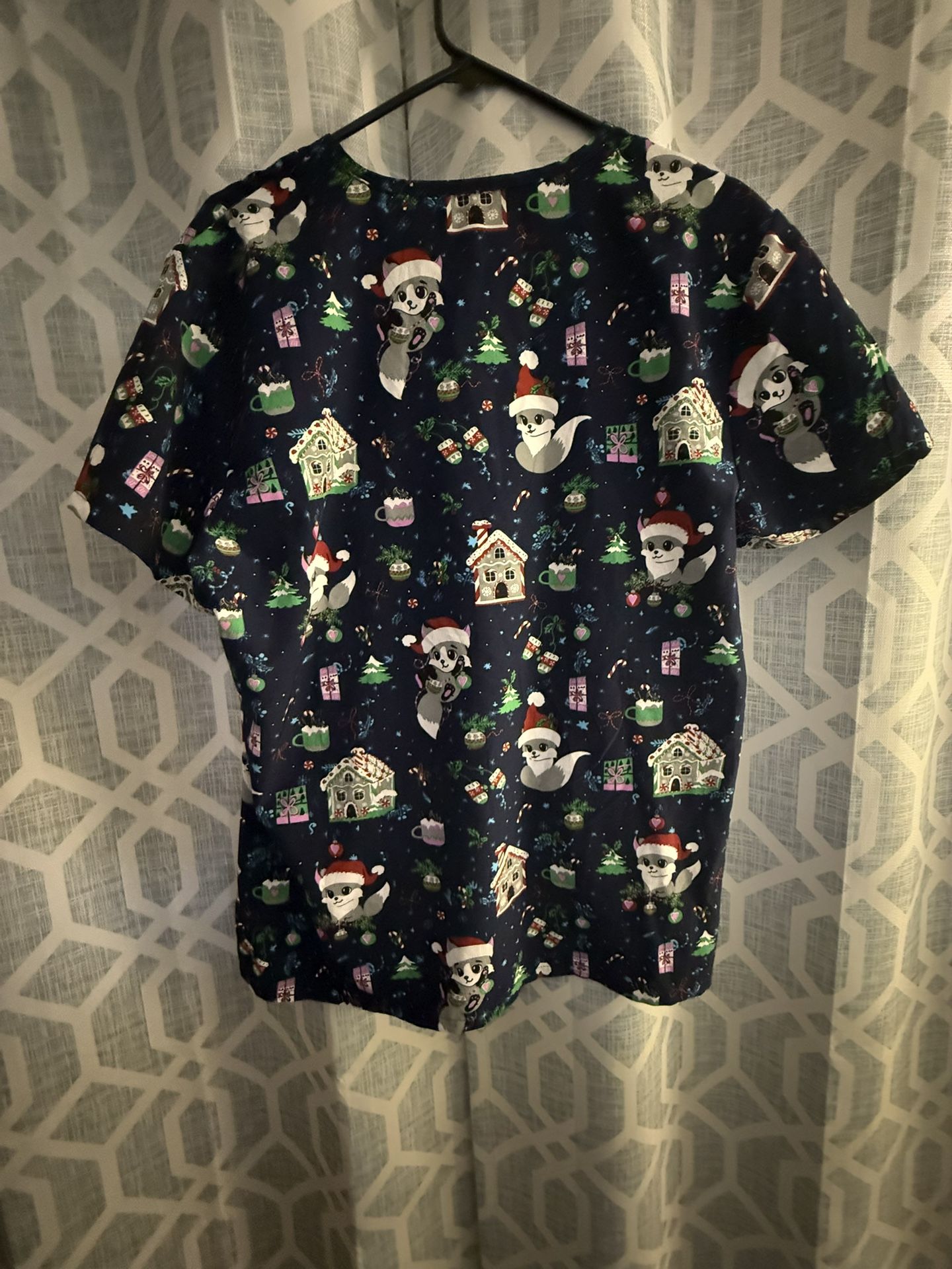 Festive navy blue scrub top featuring a fun all-over Christmas print with cute animals wearing Santa hats, gingerbread houses, candy canes, Christmas trees, hot cocoa mugs, ornaments, and gifts. A cheerful choice for healthcare workers during the holiday season. Brand: G7 Type: Scrub top Size XL Color: Navy blue with multicolor Christmas print Sleeves: Short sleeve Neckline: Rounded V-neck Fit: Relaxed/comfortable scrub fit Fabric: Lightweight woven fabric Condition: Pre-owned, excellent condition