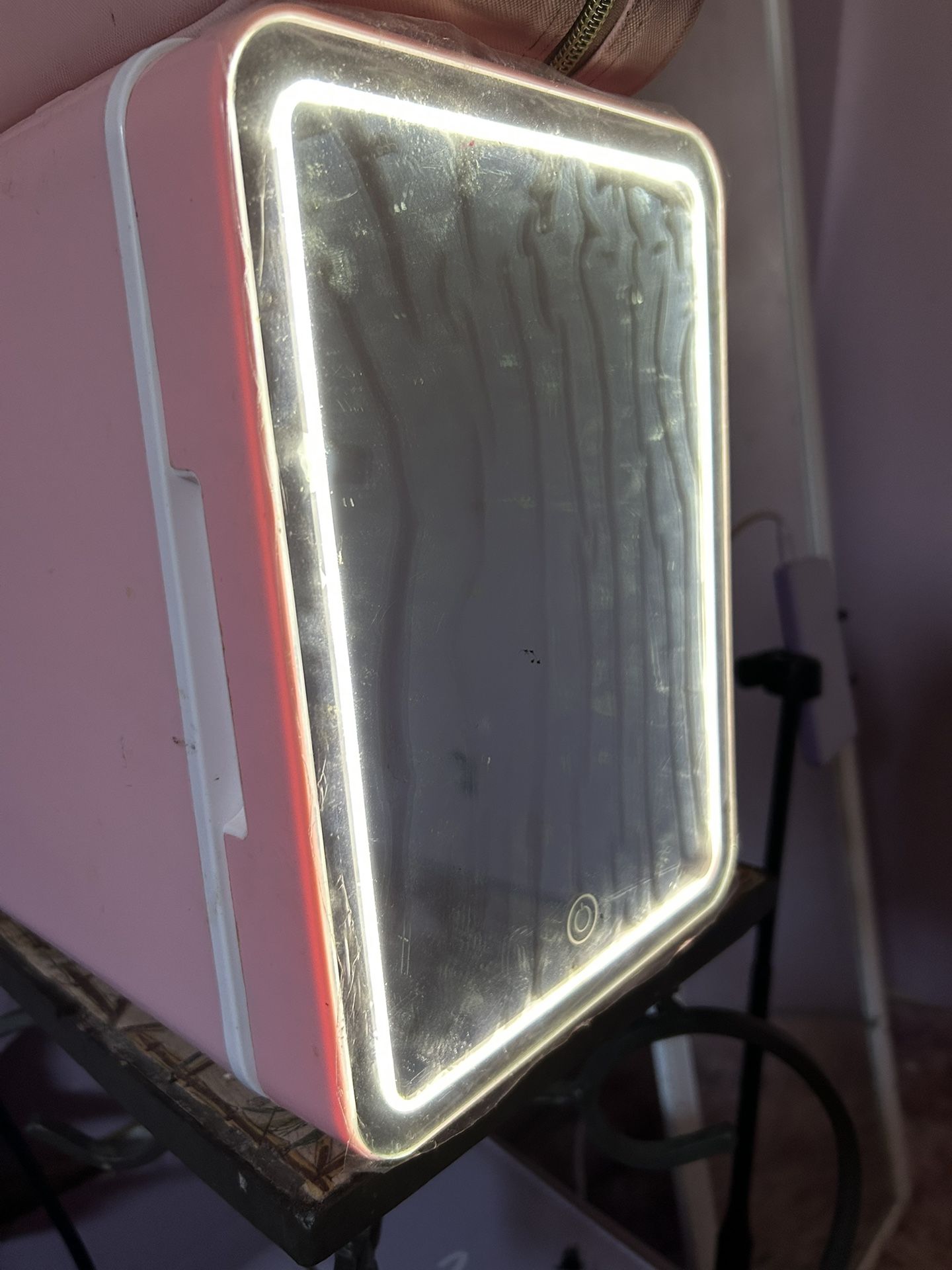 It’s a mini fridge for makeup and skincare products. The cover still on the mirror. It has hot and cold features. It’s for pickups only! Cash only!