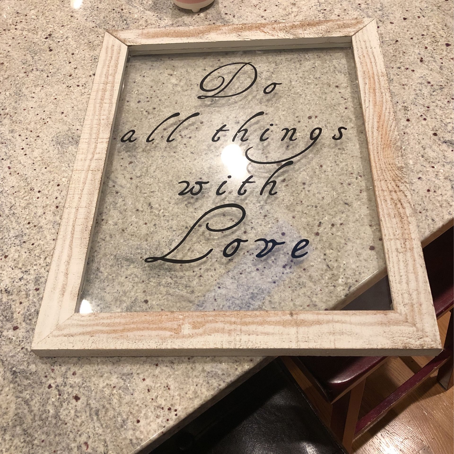 21” x 17” framed glass printed with nice thought. The frame is lite gray rough cut.