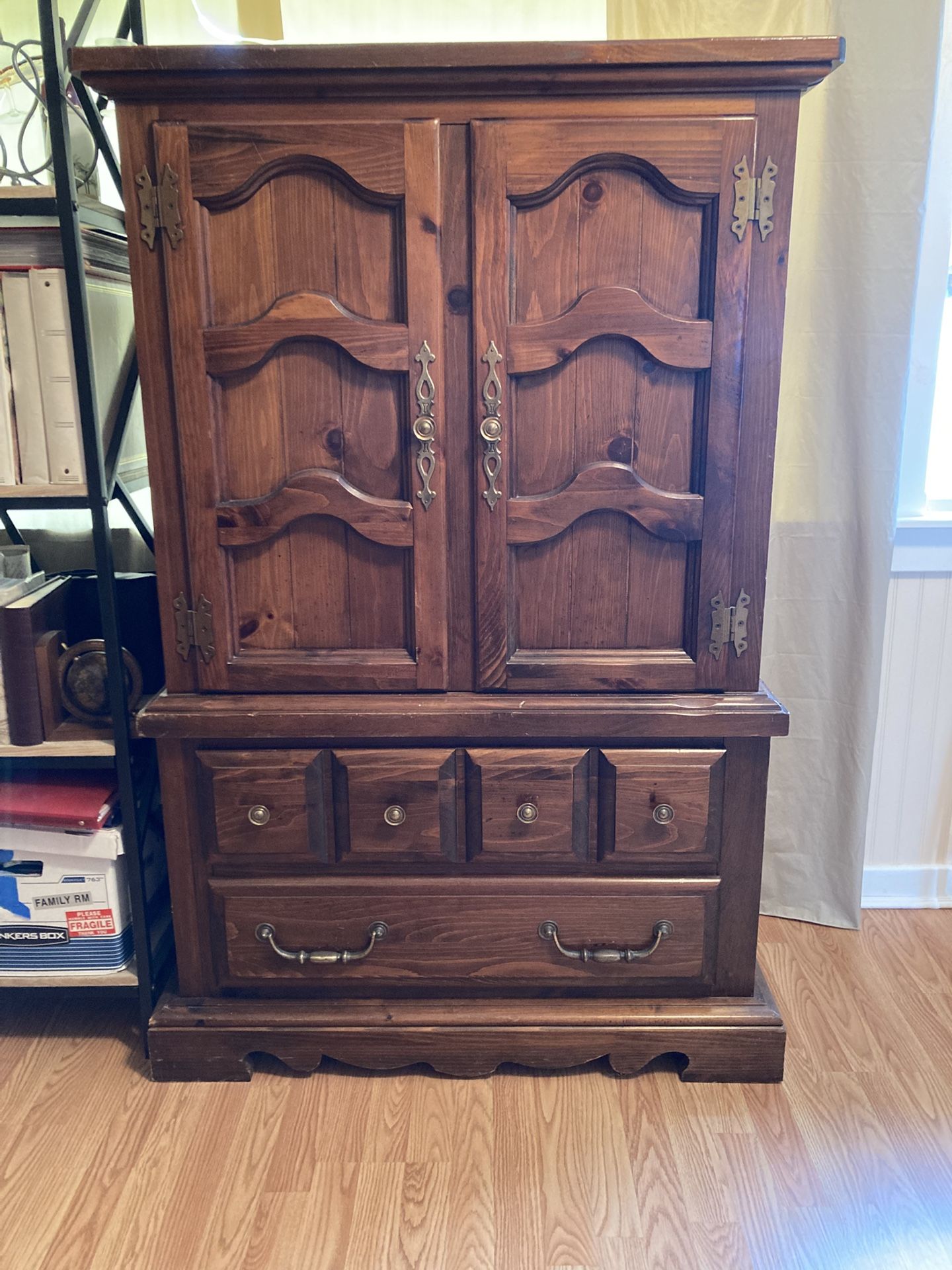Solid wood armorie, 40” wide x 19” deep x 59 1/2” high. Two doors covering 3 cubbies & 2 drawers, 2 bottom drawers. In good condition. Selling for $30.