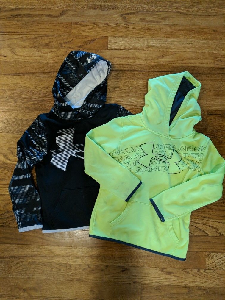 For sale, two boy's Under Armour sweatshirts. The black and white one is size small, the yellow one is size 7, which is equivalent to a size small. Both in good condition.