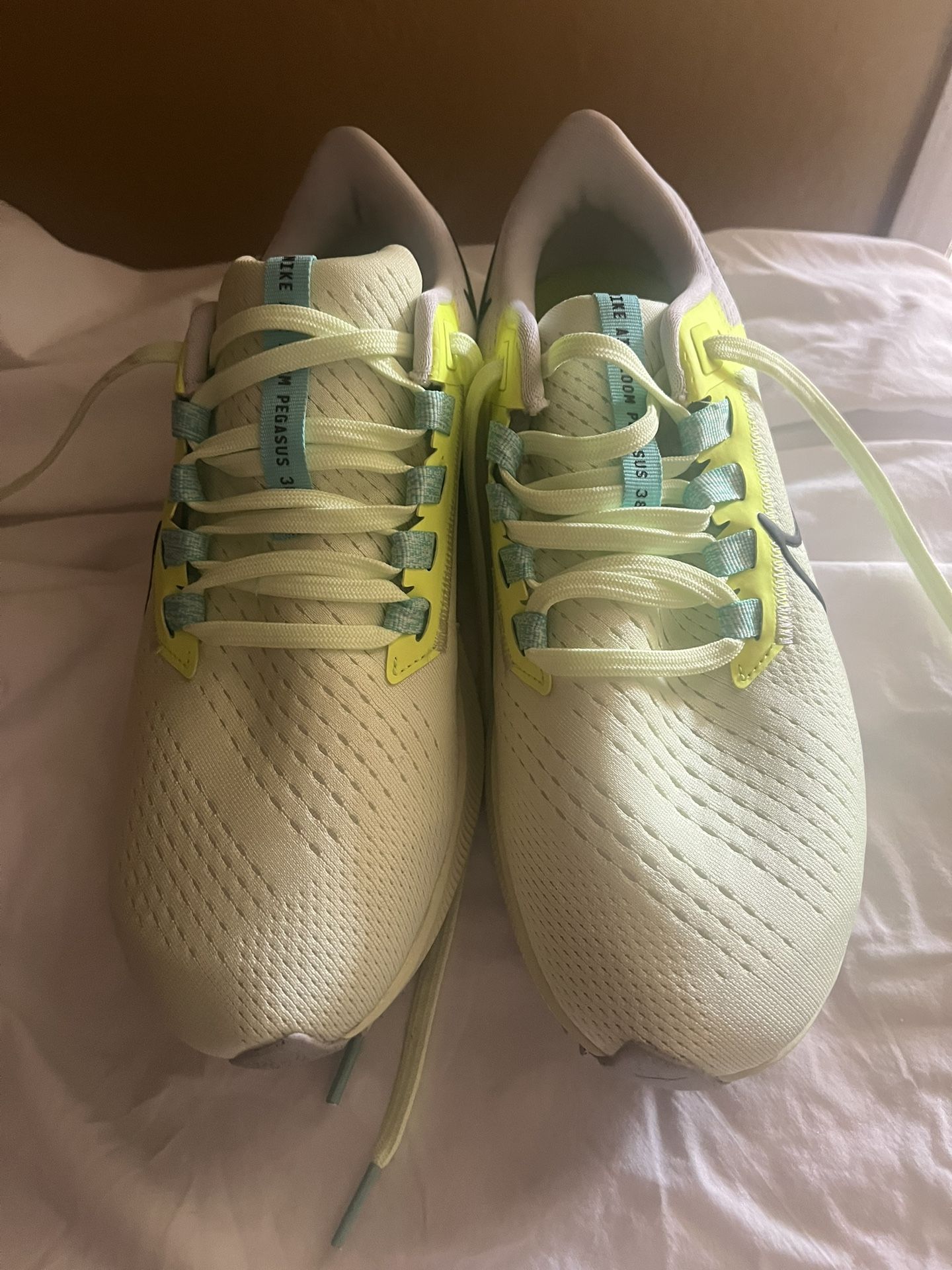 Selling a brand-new pair of Nike Air Zoom Pegasus 38 running sneakers. Never worn, perfect condition. Size 9.5 (Women’s 9.5 / Men’s equivalent ~8). Pale yellow/cream upper with volt yellow details, aqua blue lace loops, and black swoosh accents. Features • Air Zoom cushioning in the forefoot for responsive, comfortable support • Breathable mesh upper for lightweight airflow • Wide, stable heel for smoother walking or running • Full rubber outsole with waffle-inspired traction for durability • Secure midfoot fit thanks to the Pegasus 38’s lacing structure • Great everyday sneaker for walking, gym workouts, or running Condition ✔️ Brand new ✔️ No wear on soles ✔️ Clean inside & out ✔️ Laces and inserts intact ✔️ No box #nike #pegasus38 #running #sneakers #womensshoes #brandnew #size95 #athleticshoes
