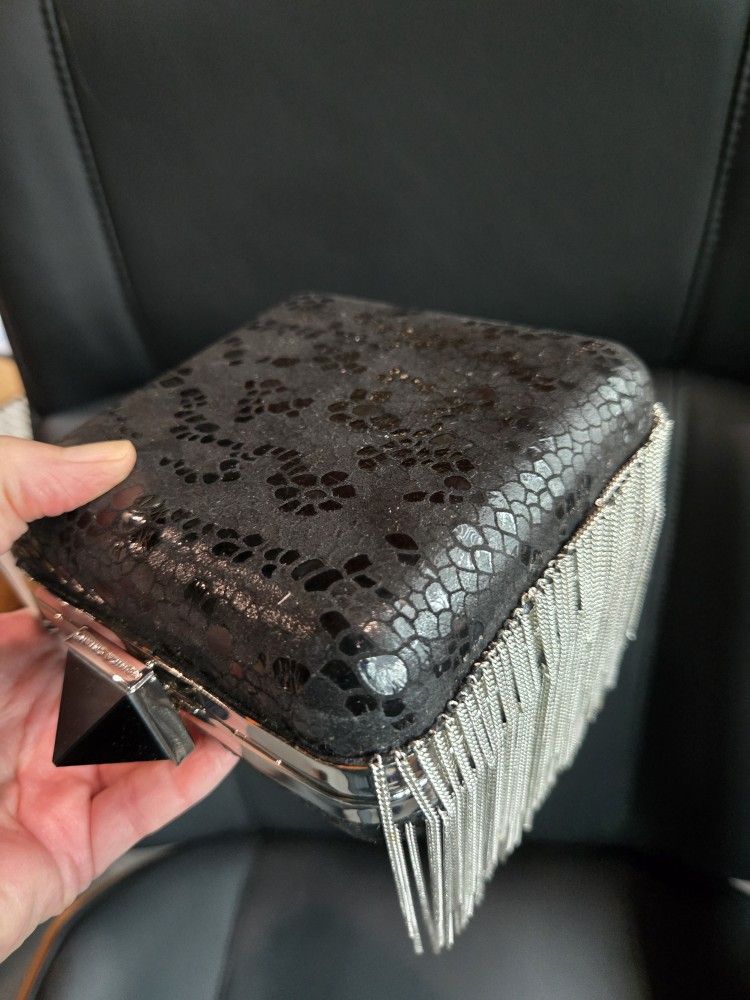 Monica Chang Bag. Black Embossed leather bang with Silver metal fringe